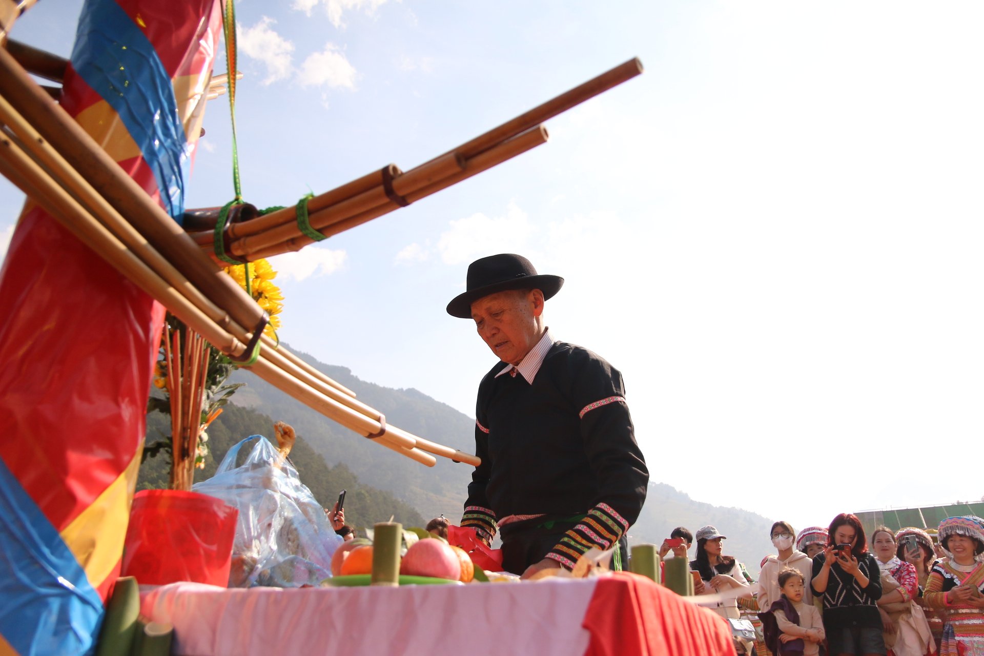 Mở màn lễ hội Gầu Tào, nghệ nhân Giàng A Su tiến hành nghi thức thắp hương và khấn xin thần linh cho phép mở hội trước cây nêu.