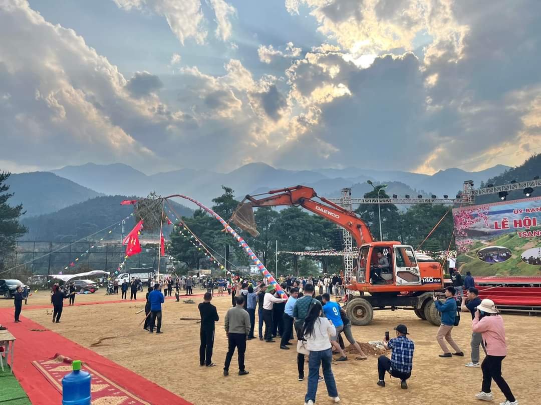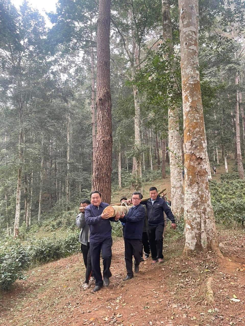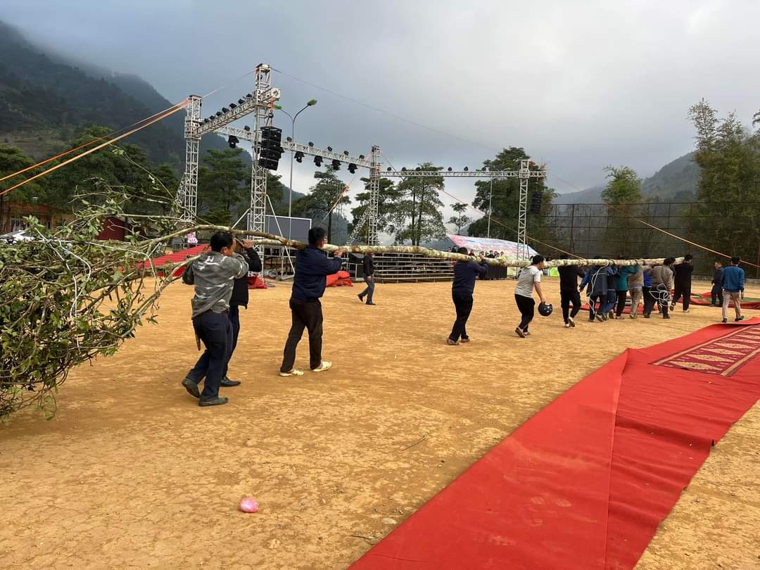 Để chuẩn bị cho lễ hội, lãnh đạo huyện Trạm Tấu (Yên Bái) vác cây làm cây nêu cho lễ hội Gầu Tào.