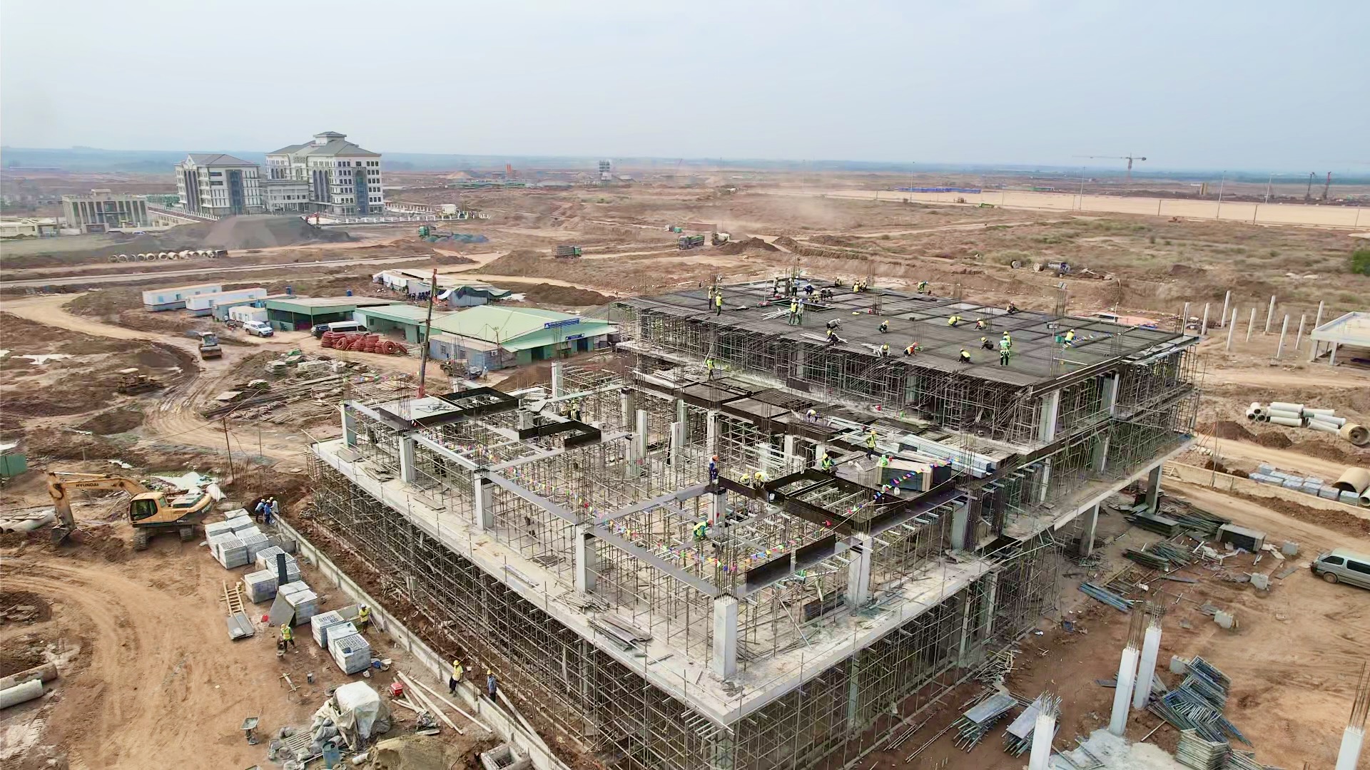 Ở khu vực sân đường nội bộ, từng đoàn xe chở vật liệu nối đuôi nhau ra vào không ngớt. Phía mặt ngoài trụ sở, lớp vữa tô trát được đẩy nhanh để kịp tiến độ hoàn thiện hình khối kiến trúc. Hàng rào bao quanh công trình cũng đã hoàn thành khoảng một phần tư khối lượng, bảo đảm an toàn khu vực thi công.