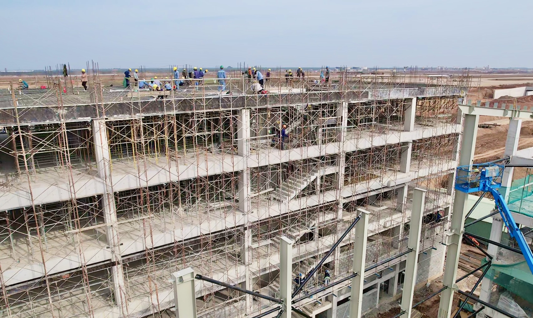 Riêng khu suất ăn hàng không do VINACS triển khai, thời điểm này đang bước vào giai đoạn tăng tốc cao nhất. Từ sáng sớm đến tối muộn, trên công trường, tiếng máy cẩu, máy hàn, xe ben ra vào liên tục không ngớt. Khi trời chuyển nắng, các mũi thi công được triển khai đồng loạt từ phần kết cấu, lắp dựng khung thép, xây dựng hệ thống kỹ thuật…