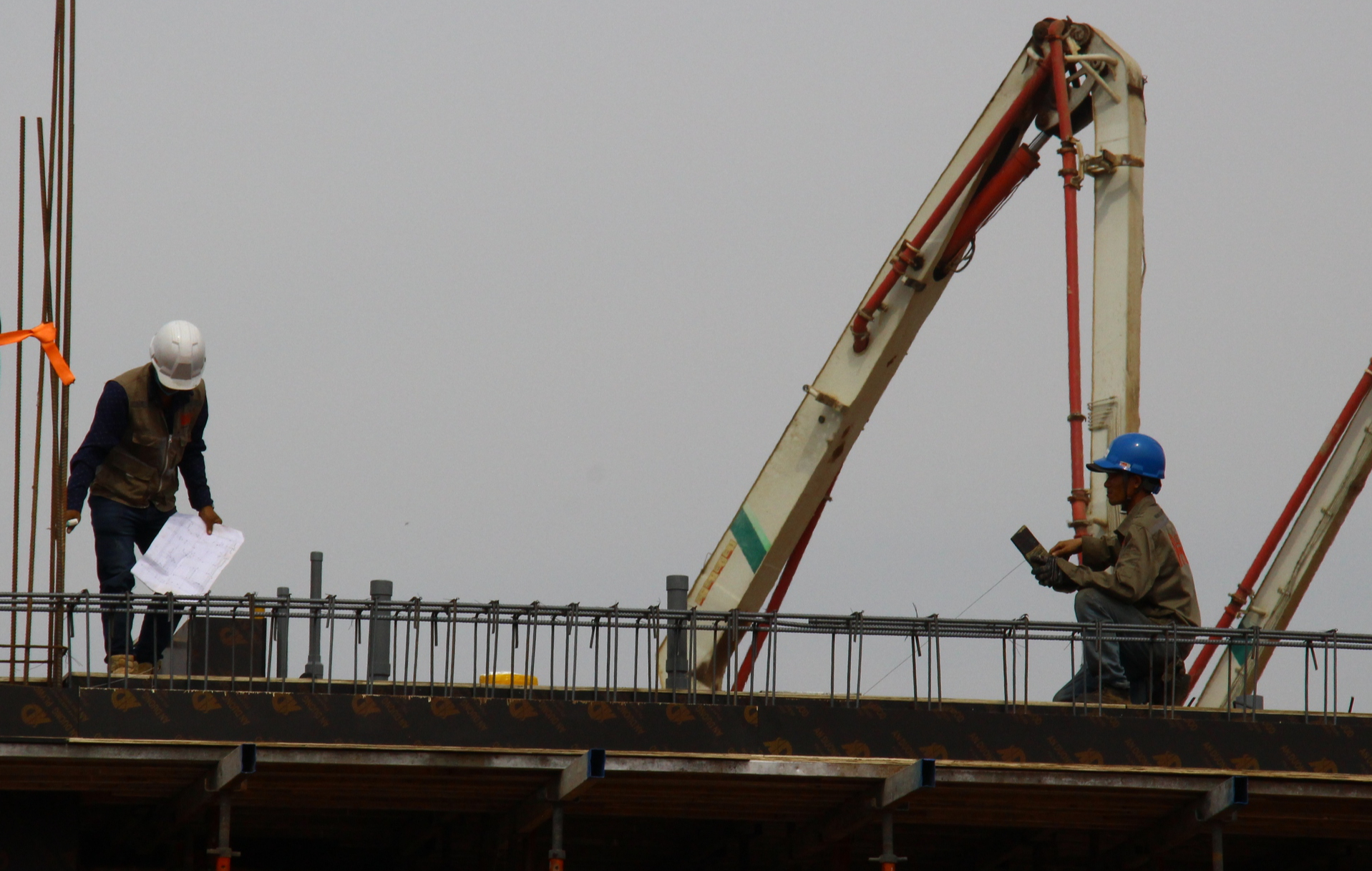 Từ sáng sớm đến tối khuya, công trường luôn rộn rã tiếng máy khoan, búa đinh, động cơ xe ben liên tục gầm vang vận chuyển vật liệu ra vào công trường. Trên cao, những cẩu tháp vươn dài “cánh tay” thép hoạt động nhịp nhàng, chính xác. Còn dưới đất hay trên các tòa nhà, từng tốp công nhân trong sắc áo phản quang, mũ bảo hộ chỉnh tề khẩn trương di chuyển, miệt mài lao động, hòa vào nhịp thi công gấp gáp hối hả.