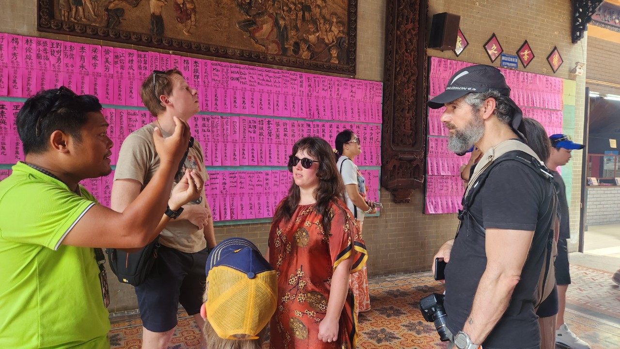 Ông Vương Bá Giang (du khách hình ở giữa) chia sẻ, ông là người Việt gốc Hoa nên thường ghé chùa Bà Thiên Hậu vào các ngày lễ, Tết quanh năm để cầu bình an cho gia đình.