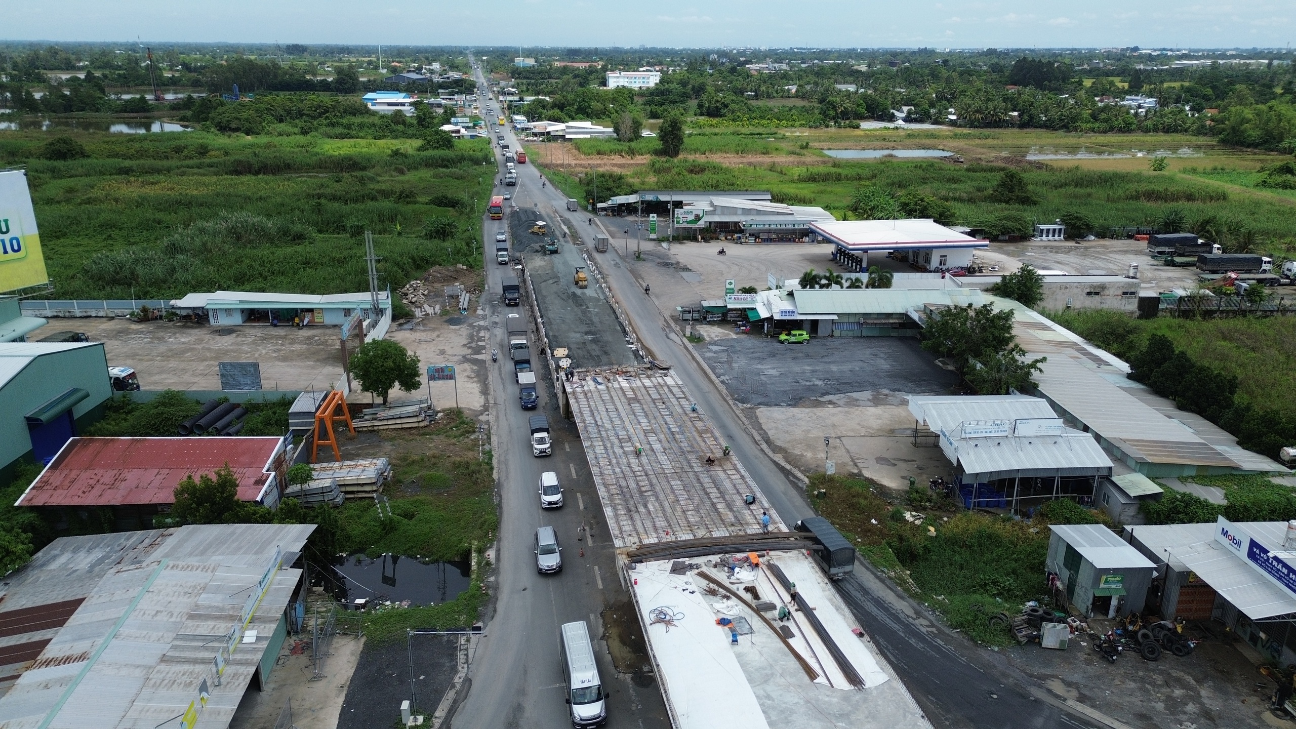 Tại cầu vượt nút giao Lộ Tẻ kết nối các tuyến QL80, tuyến tránh Long Xuyên, cao tốc Lộ Tẻ - Rạch Sỏi, nhà thầu đang thi công với tinh thần "vượt nắng, thắng mưa" để sớm thông xe nút giao.