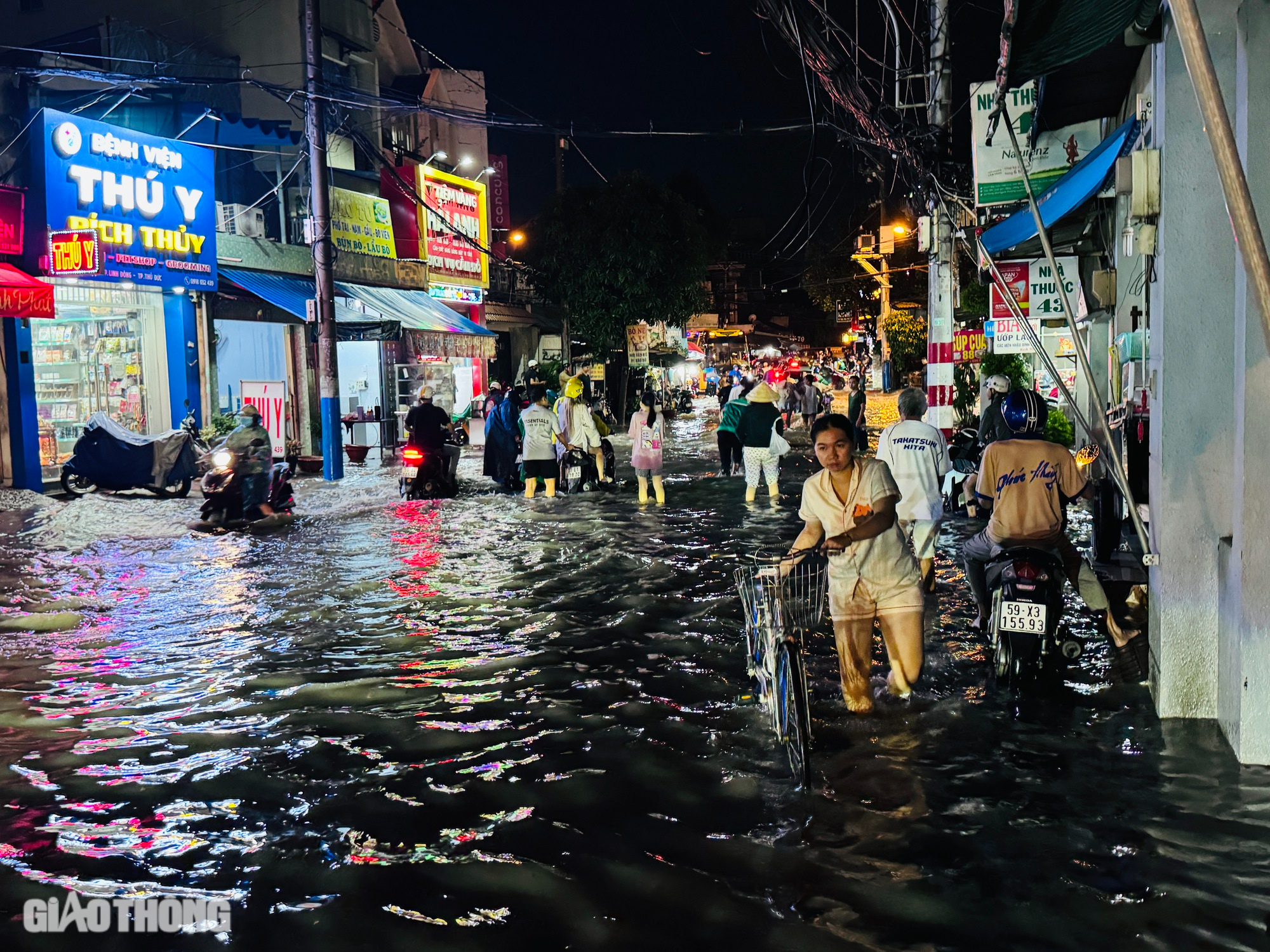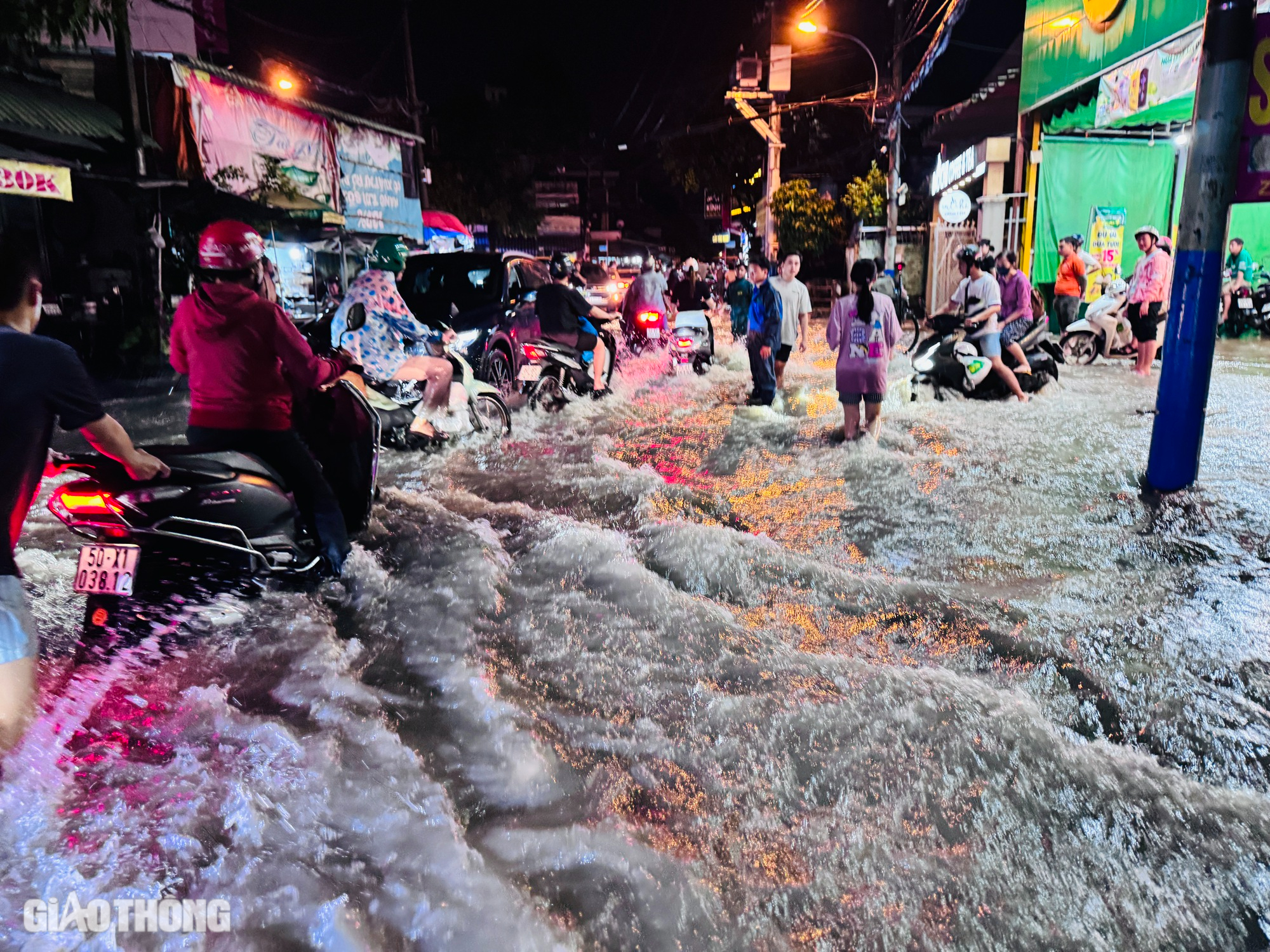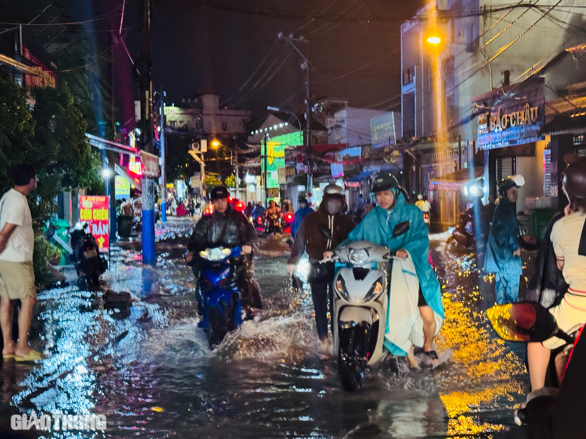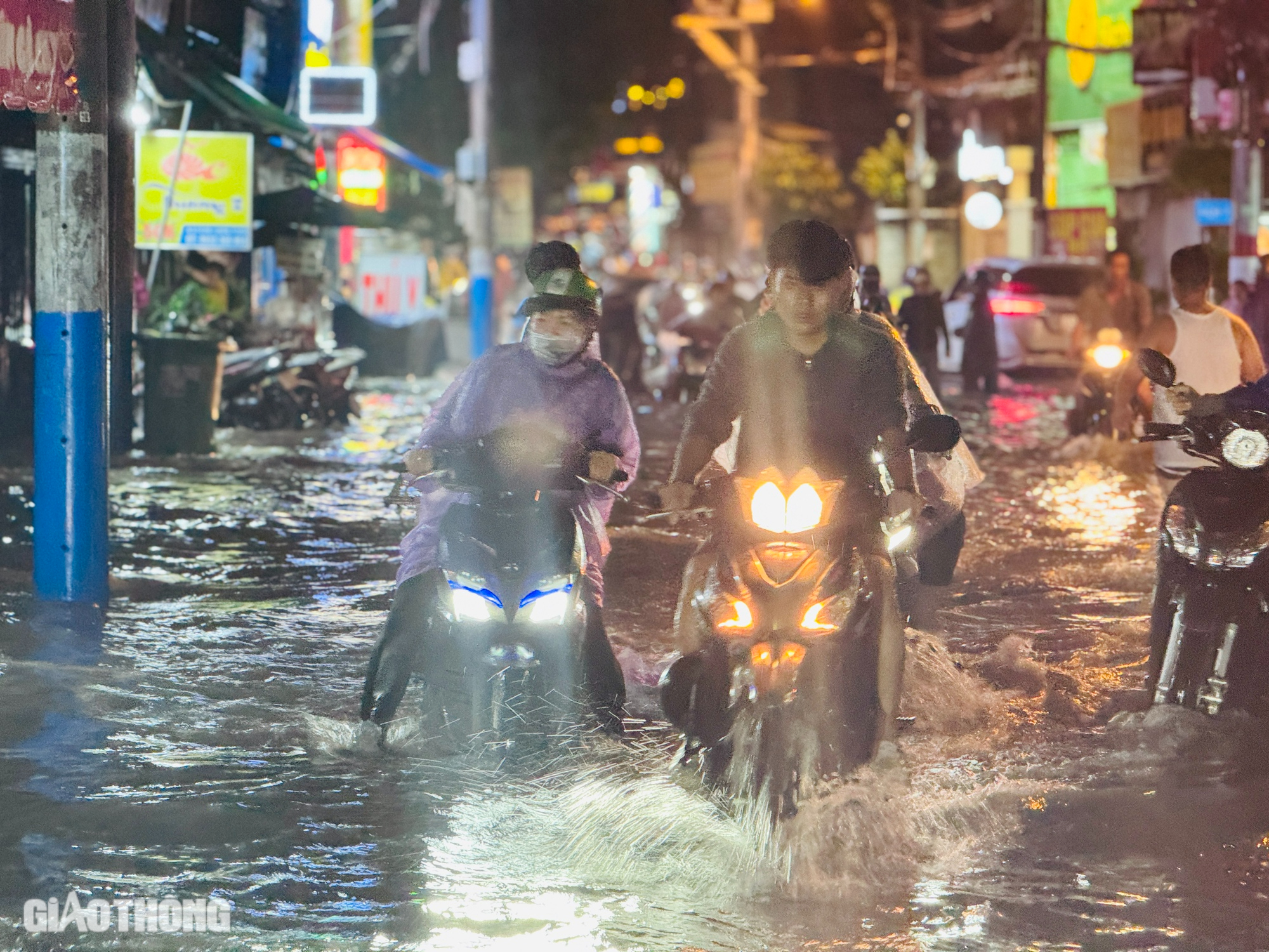Theo ghi nhận của PV Báo Giao thông, từ gần 18h đến 19h30, đầu đường Lý Tế Xuyên, phường Linh Đông, TP Thủ Đức (đoạn giáp với đường Phạm Văn Đồng) ngập nặng gần 1km. Thời điểm nước cao nhất lên đến gần yên xe máy.