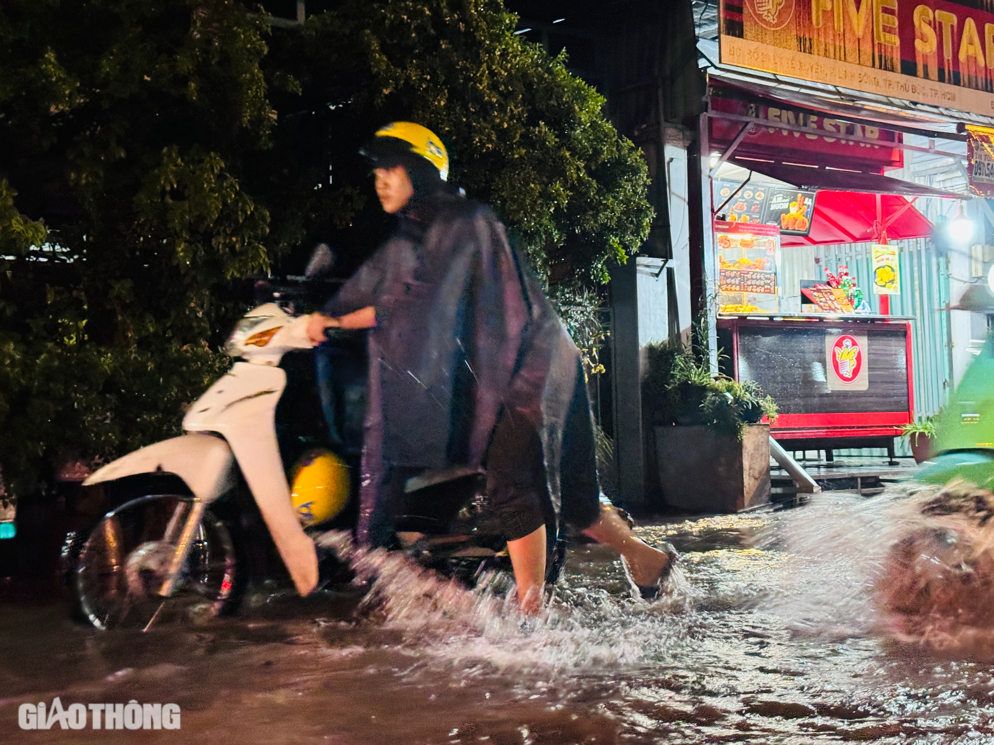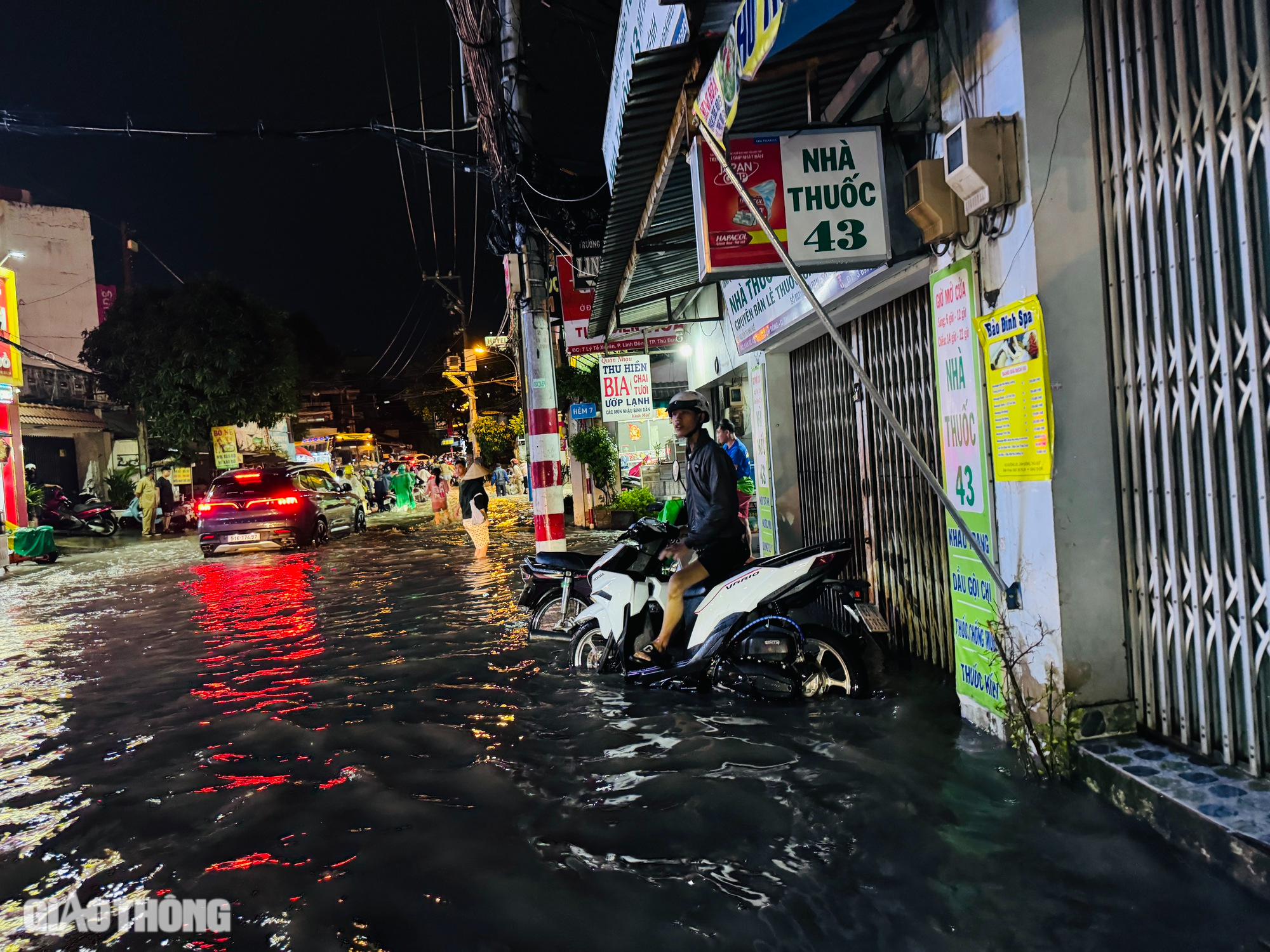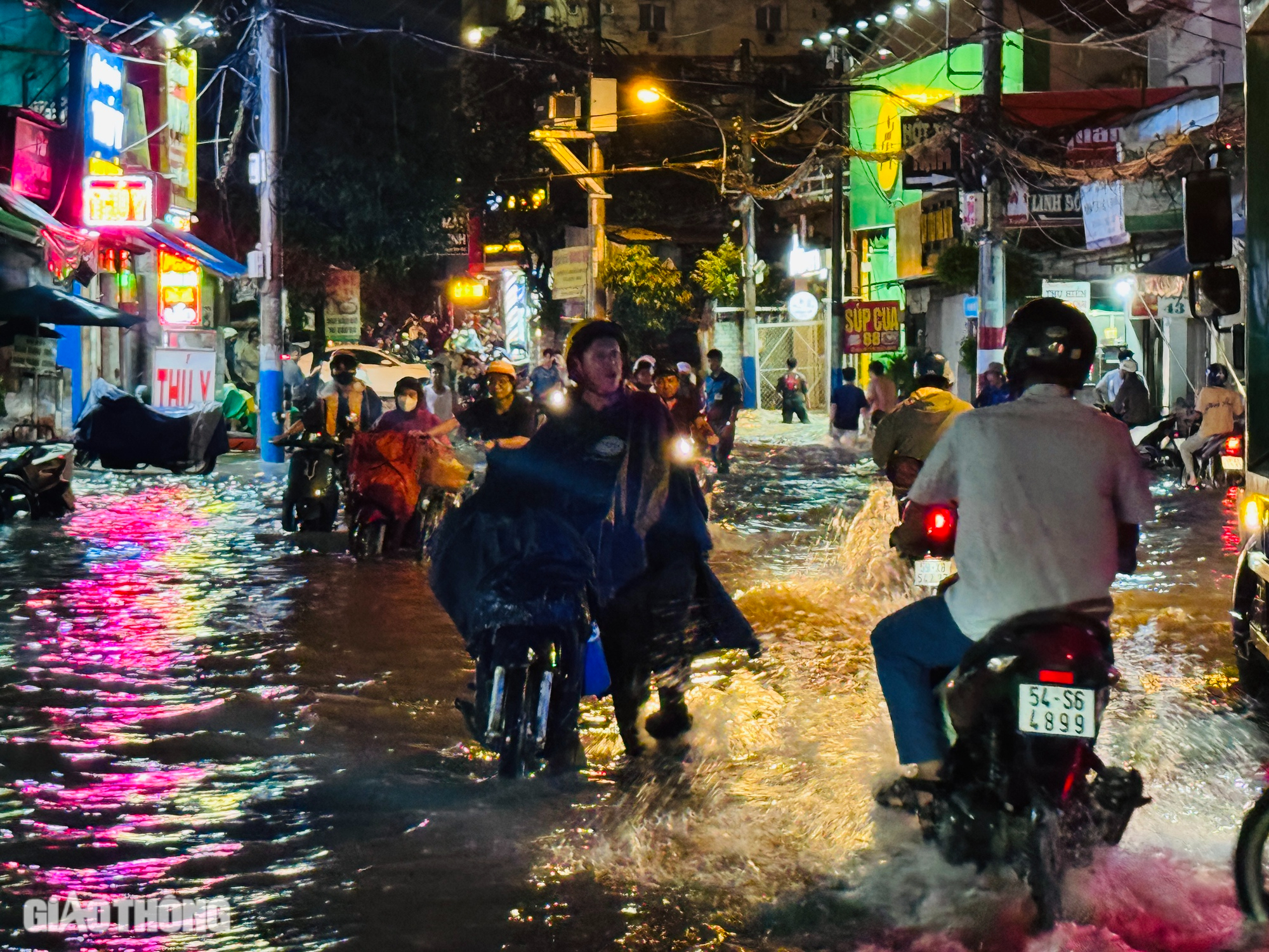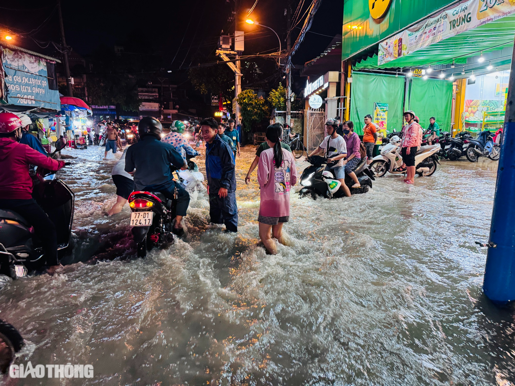 Theo ghi nhận của PV Báo Giao thông, từ gần 18h đến 19h30, đầu đường Lý Tế Xuyên, phường Linh Đông, TP Thủ Đức (đoạn giáp với đường Phạm Văn Đồng) ngập nặng gần 1km. Thời điểm nước cao nhất lên đến gần yên xe máy.