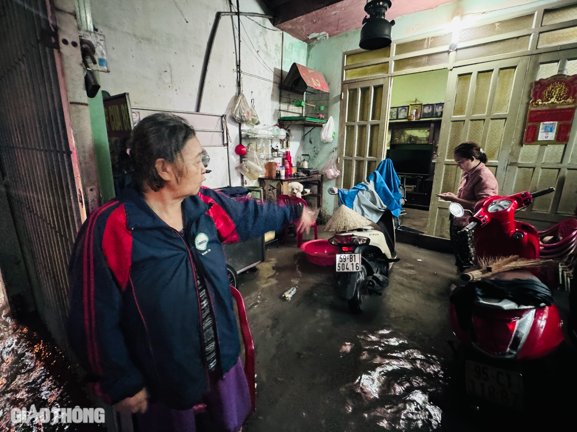 Bà Sinh, một người dân sống bên đường chia sẻ, nước ngập tràn hết vào nhà, tràn ra tận phía sau. Theo bà Sinh, năm nay bị ngập khủng khiếp nhất từ trước tới nay, các năm trước có ngập nhưng cũng chỉ ở ngoài đường, không tràn vào nhà.