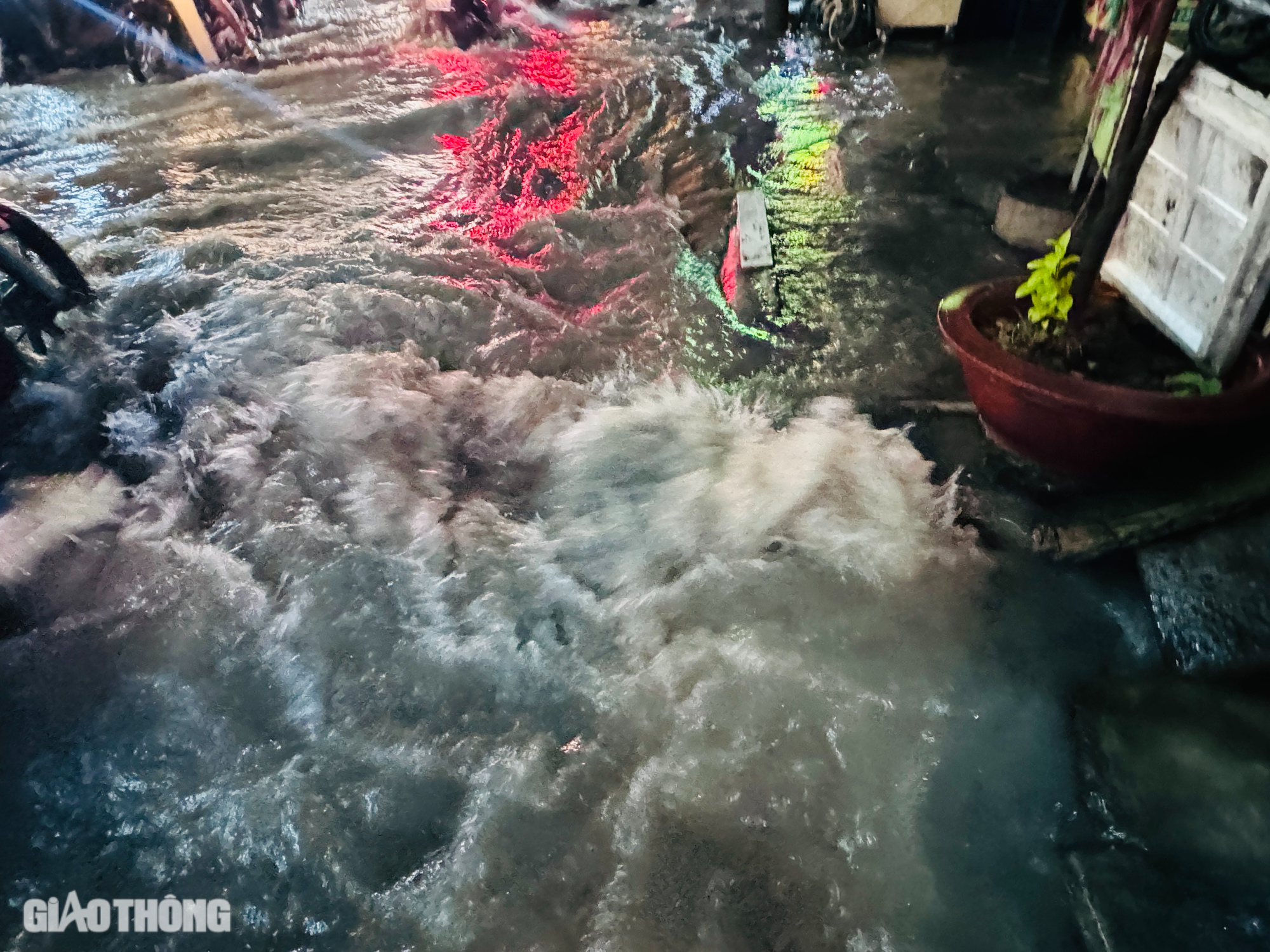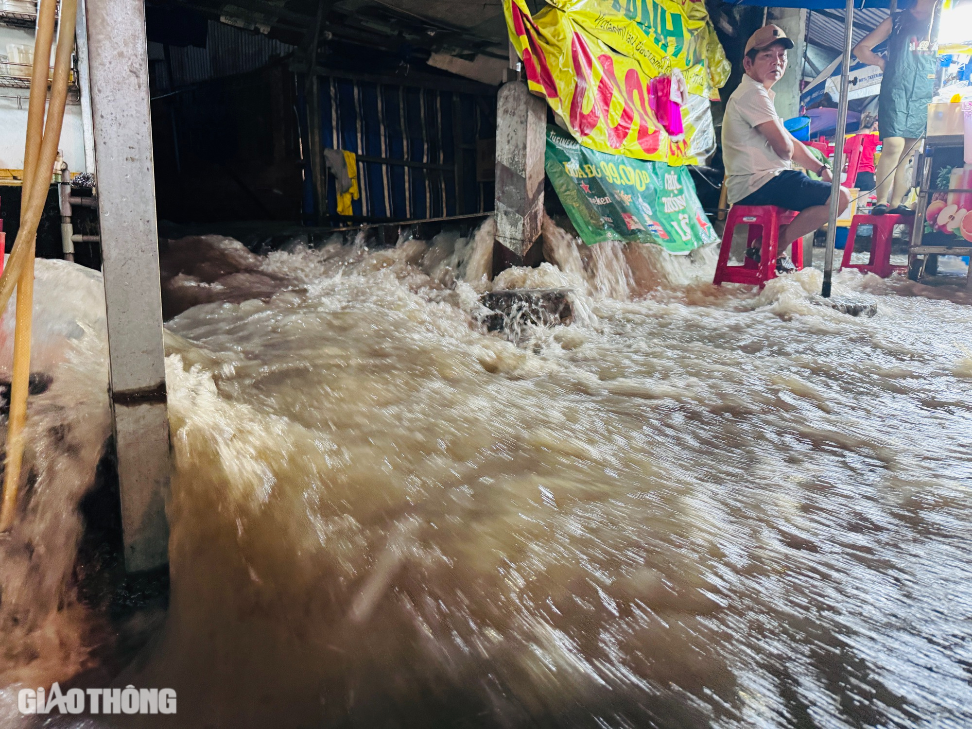 Tuy nhiên, tại một số khu vực khác, do phần đường trũng, nước mưa tràn xuống và phun từ các miệng cống lên khiến đường sá ngập nặng, giao thông ùn ứ nghiêm trọng.
