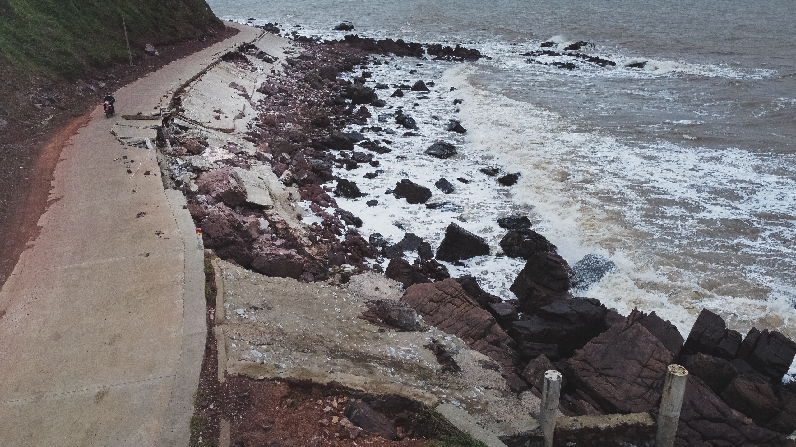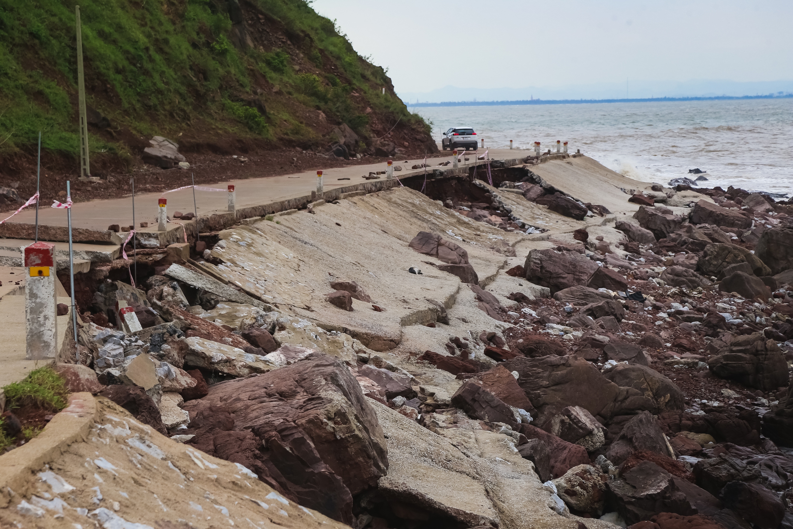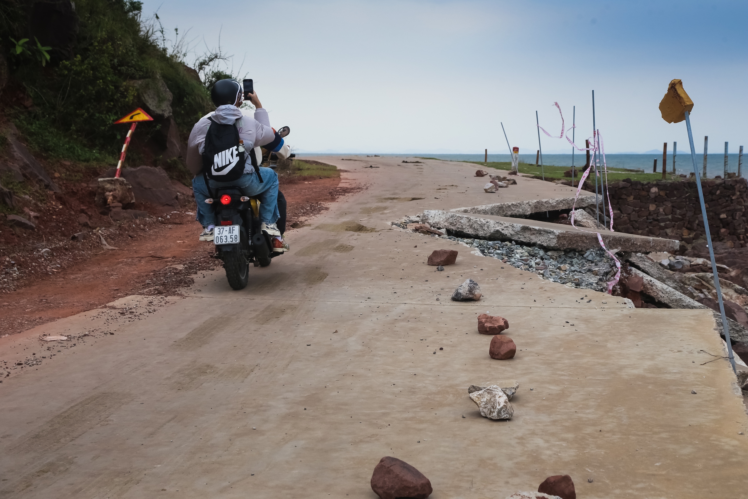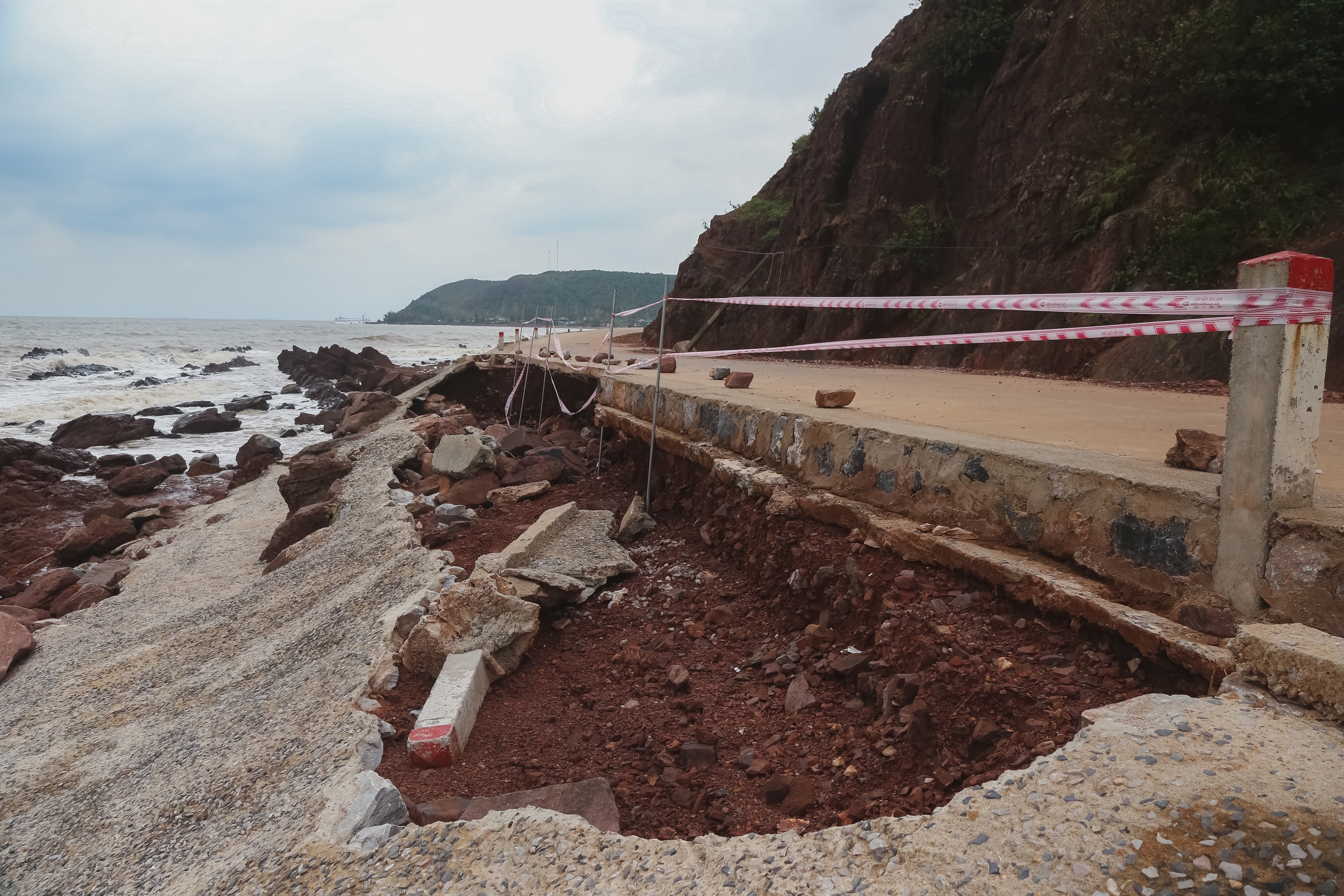 Có vị trí nền đất bị ăn quá sâu, nên mặt đường bê tông phía trên cũng bị vỡ ra, trượt xuống biển. Để đảm bảo an toàn, chính quyền địa phương đã phải căng dây phản quang để cảnh báo cho người và phương tiện tham gia giao thông.