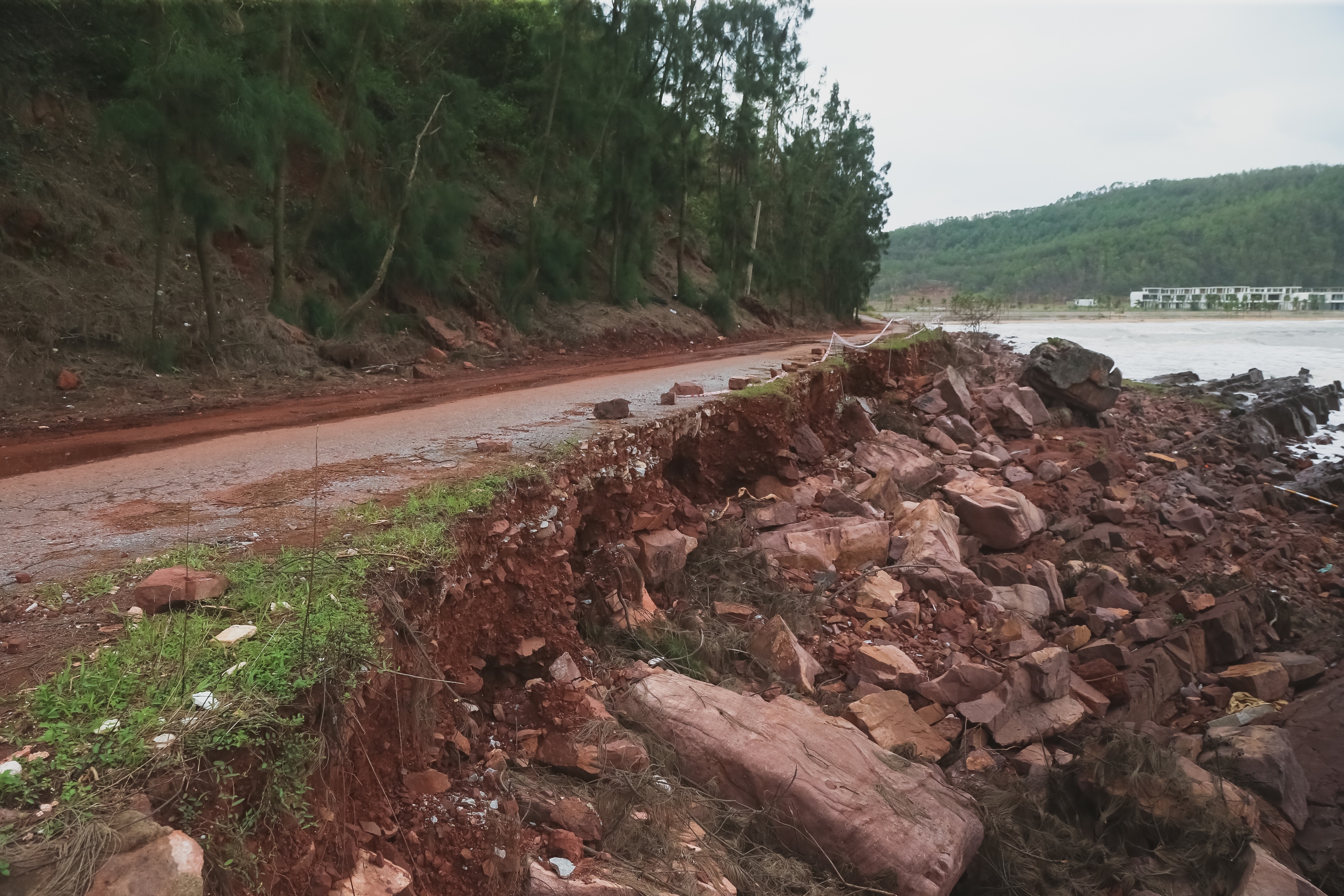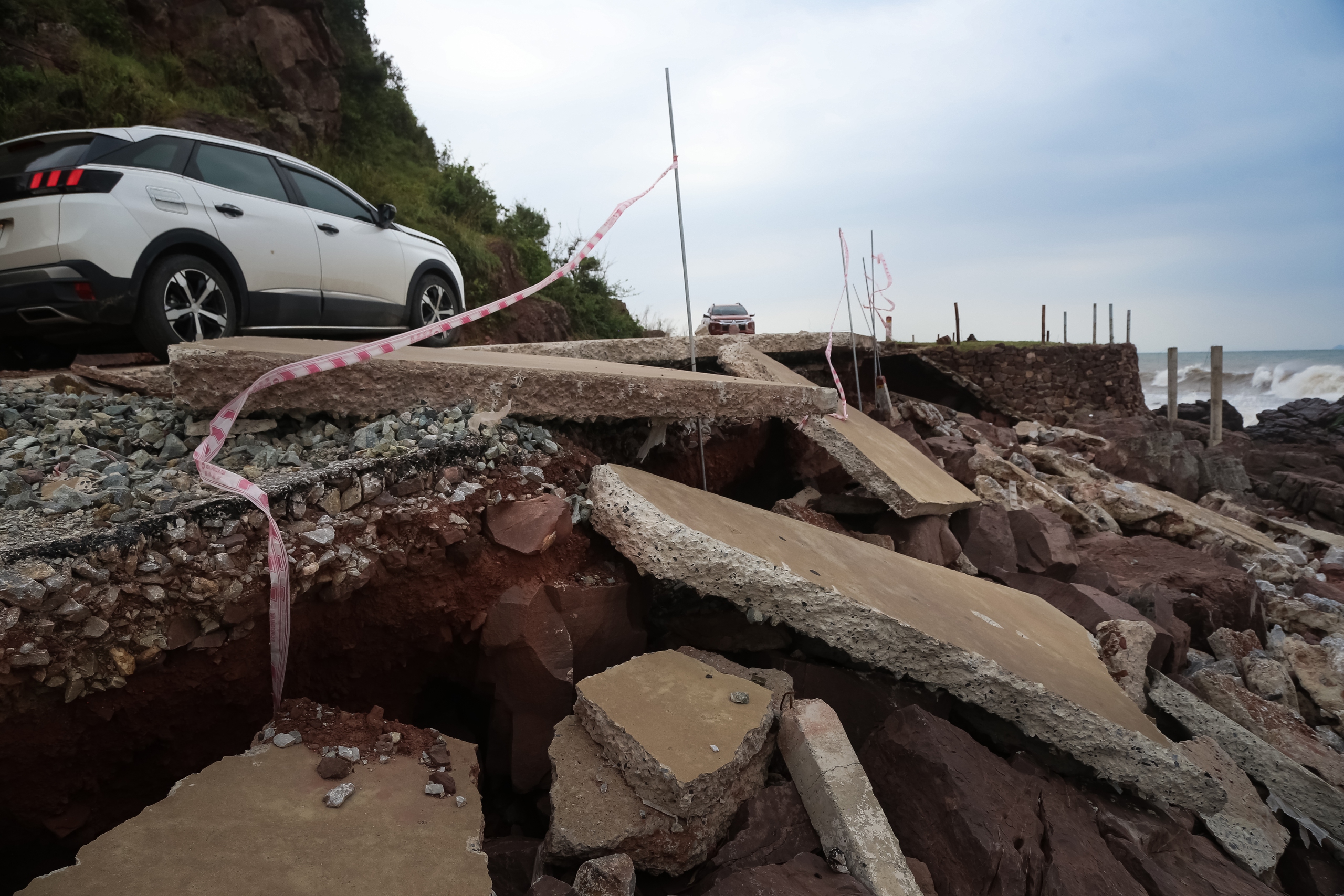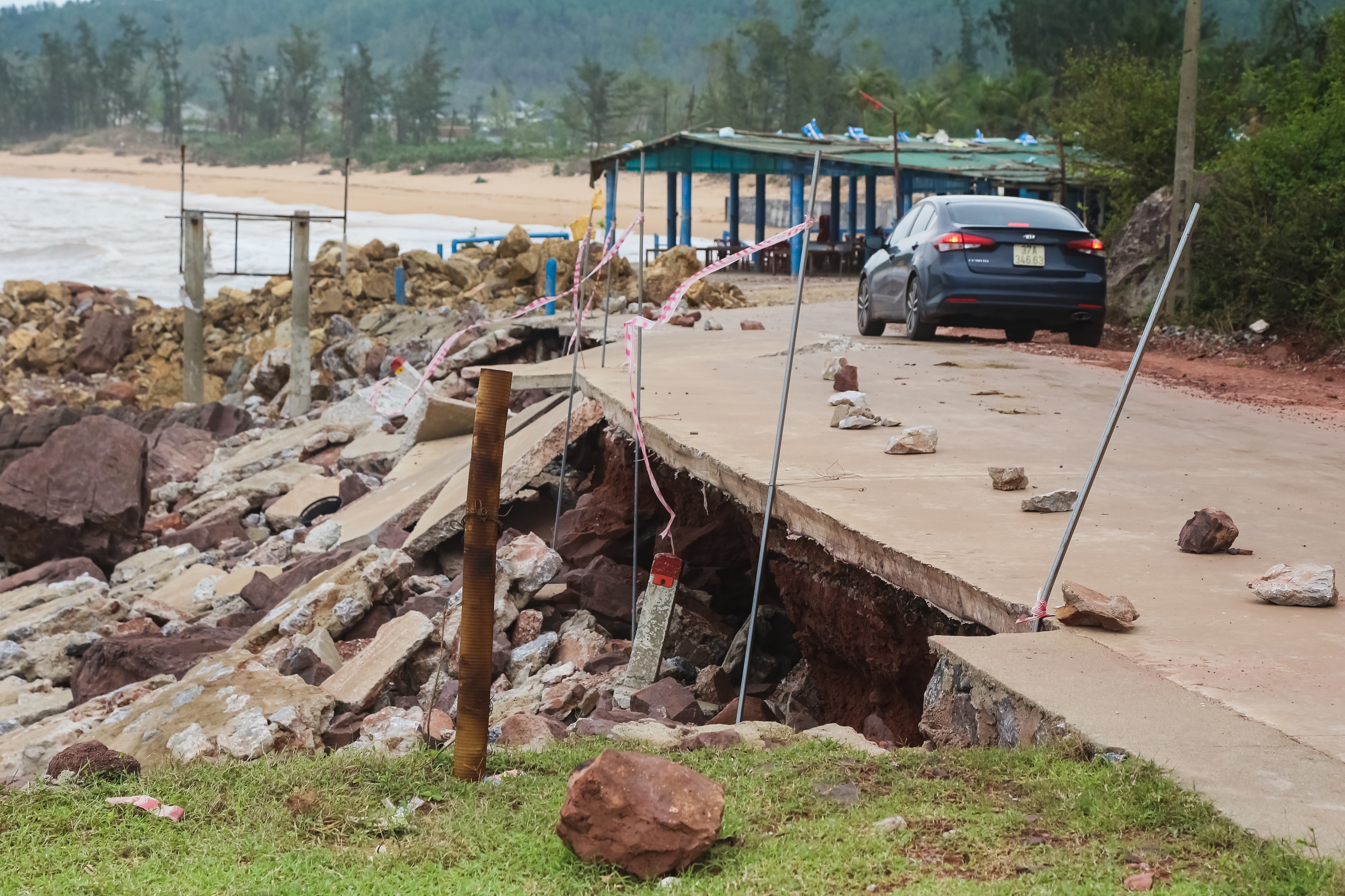 Có vị trí nền đất bị ăn quá sâu, nên mặt đường bê tông phía trên cũng bị vỡ ra, trượt xuống biển. Để đảm bảo an toàn, chính quyền địa phương đã phải căng dây phản quang để cảnh báo cho người và phương tiện tham gia giao thông.
