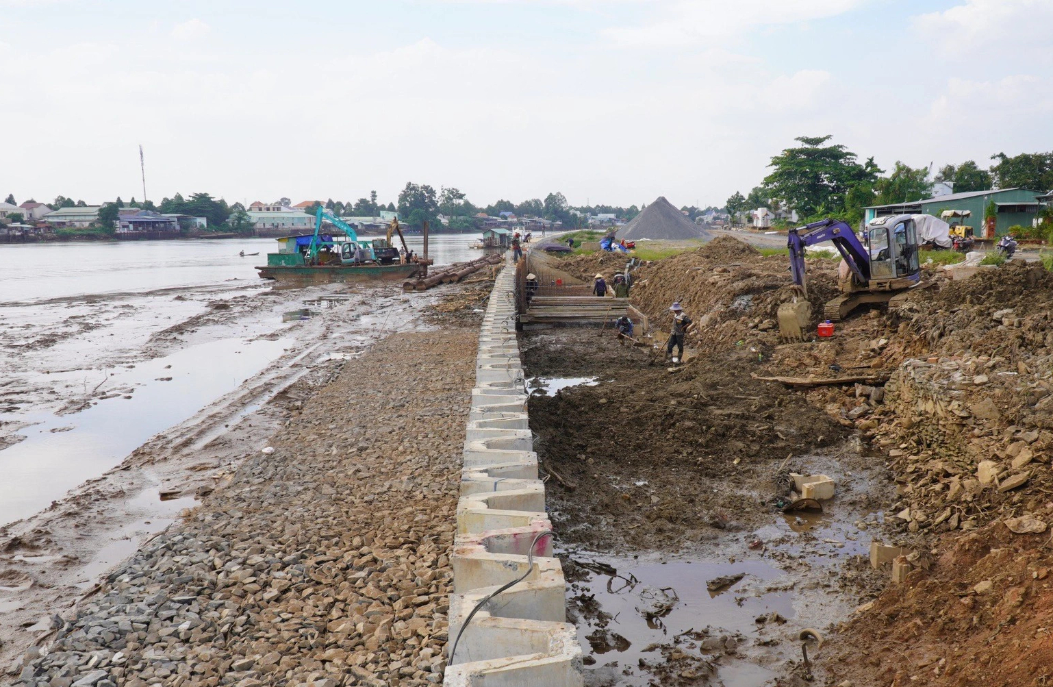 Nhiều thiết bị, công nhân, vật liệu được nhà thầu huy động, tập kết phục vụ thi công kết cấu phần trên và đường đầu cầu Rạch Lung và toàn dự án.