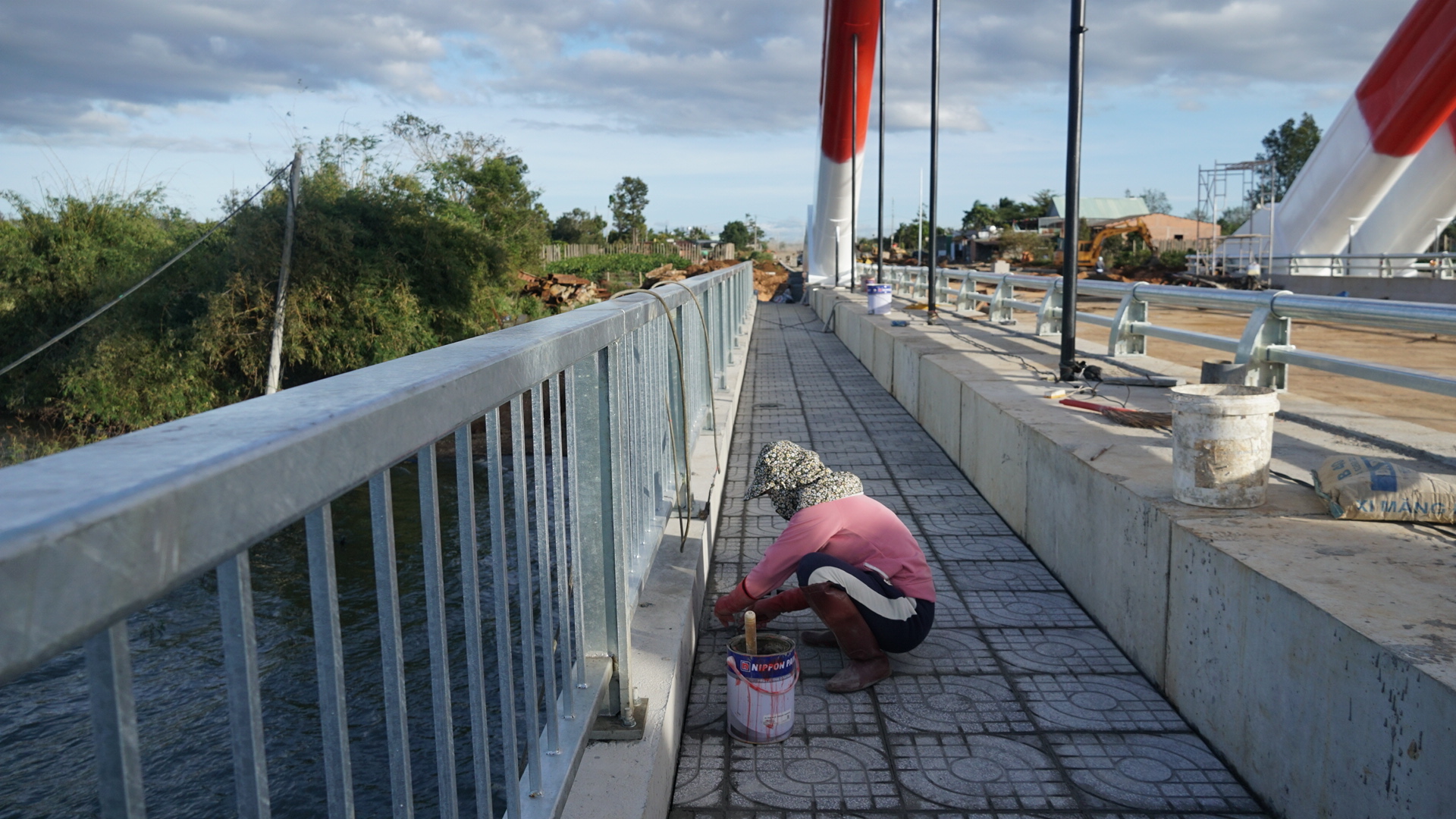 Những công nhân tiến hành "làm đẹp" cho chiếc cầu Biển Hồ trước khi công trình được đưa vào sử dụng.