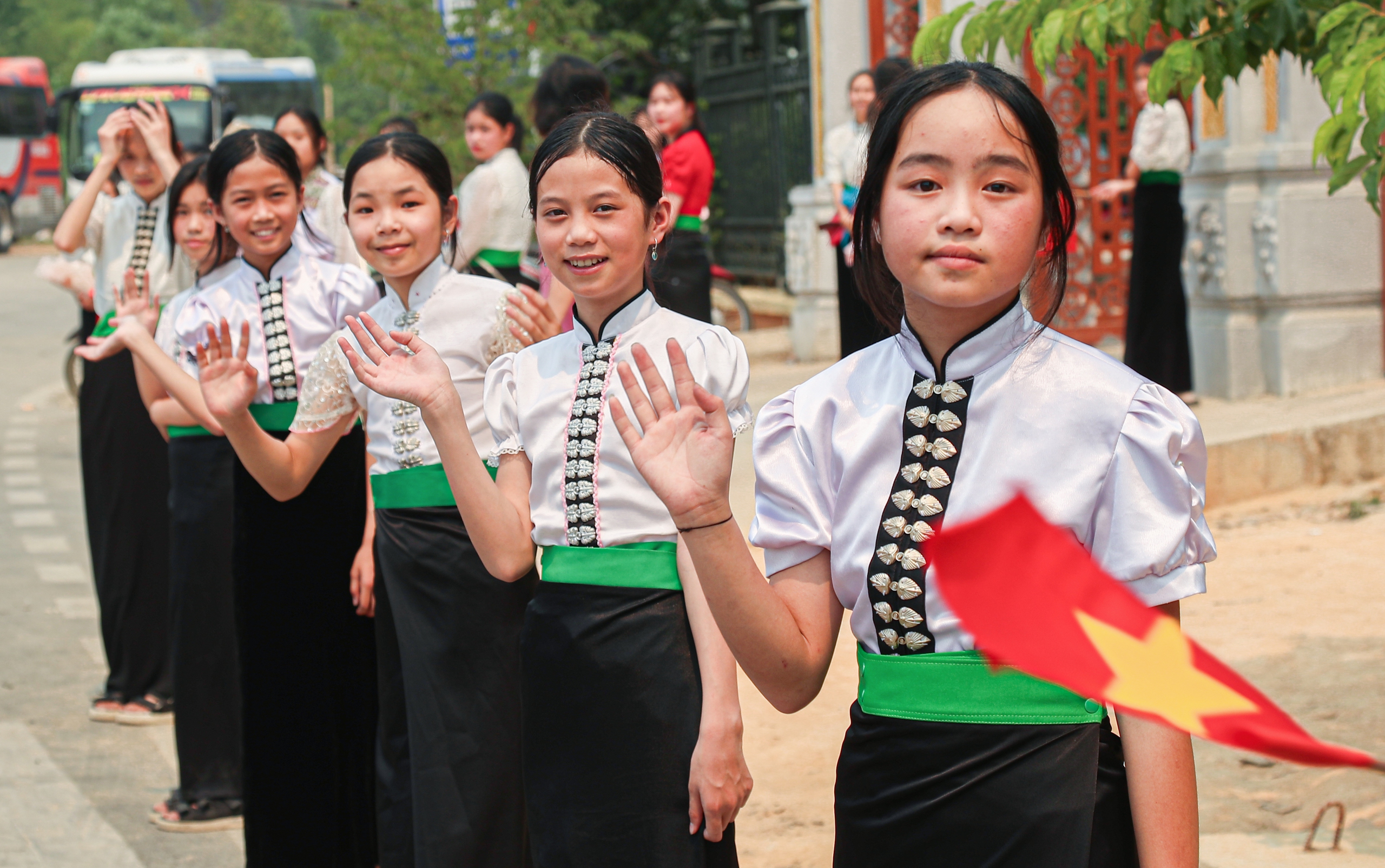 Đoàn VĐV nhận được sự chào đón nồng nhiệt của ban tổ chức, chính quyền địa phương và các em học sinh tại xã Mường Phăng.