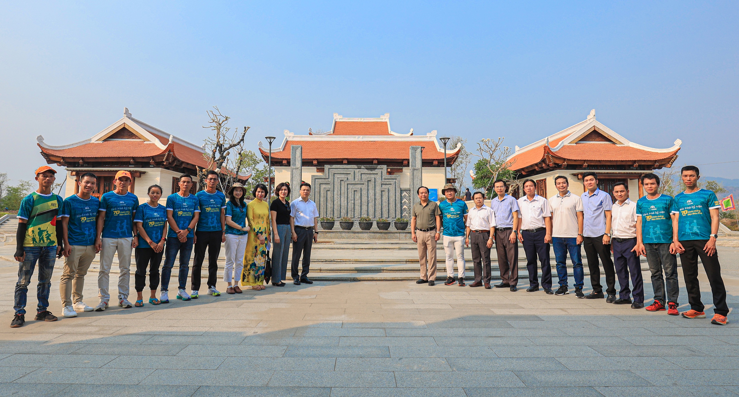 Đoàn đại biểu và các VĐV chụp ảnh lưu niệm tại Đền thờ liệt sỹ chiến trường Điện Biên Phủ.
