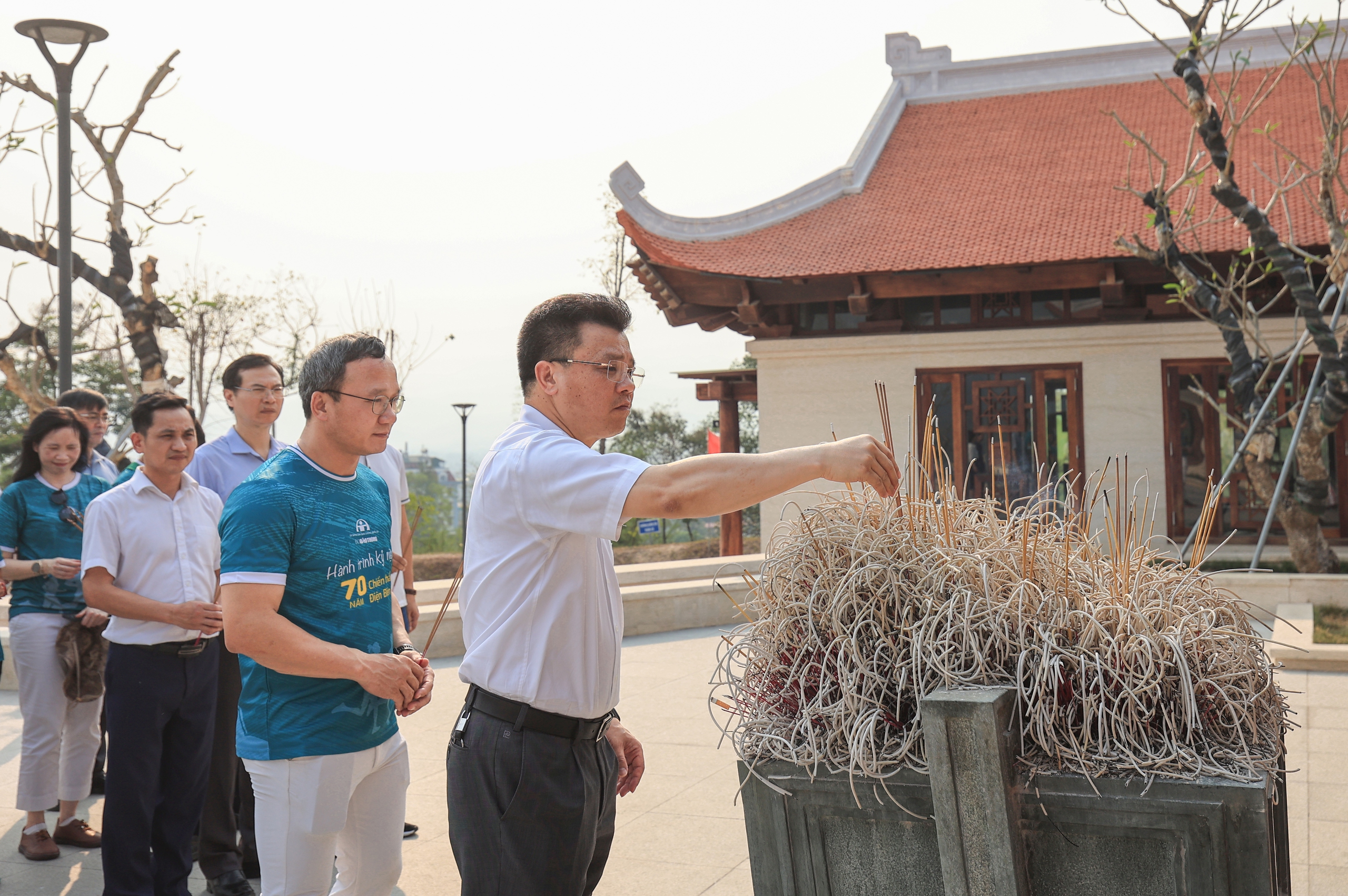 Cũng tại nơi đây, ngày mùng 7/5/1954, là một mốc son chói lọi bằng vàng, với “56 ngày đêm, khoét núi, ngủ hầm, mưa dầm, cơm vắt, máu trộn bùn non, gan không núng, chí không mòn”, tất cả để tạo nên “Chín năm làm một Điện Biên, nên vành hoa đỏ, nên thiên sử vàng”, chiến thắng Điện Biên Phủ đã trở thành biểu tượng của chủ nghĩa anh hùng cách mạng, sự kế thừa, phát huy truyền thống, lịch sử vẻ vang hàng nghìn năm dựng nước và giữ nước của dân tộc Việt Nam (Trong ảnh: Ông Lê Kim Thành, Phó chủ tịch chuyên trách Ủy ban An toàn giao thông Quốc gia dâng hương tại Đền thờ liệt sỹ chiến trường Điện Biên Phủ).
