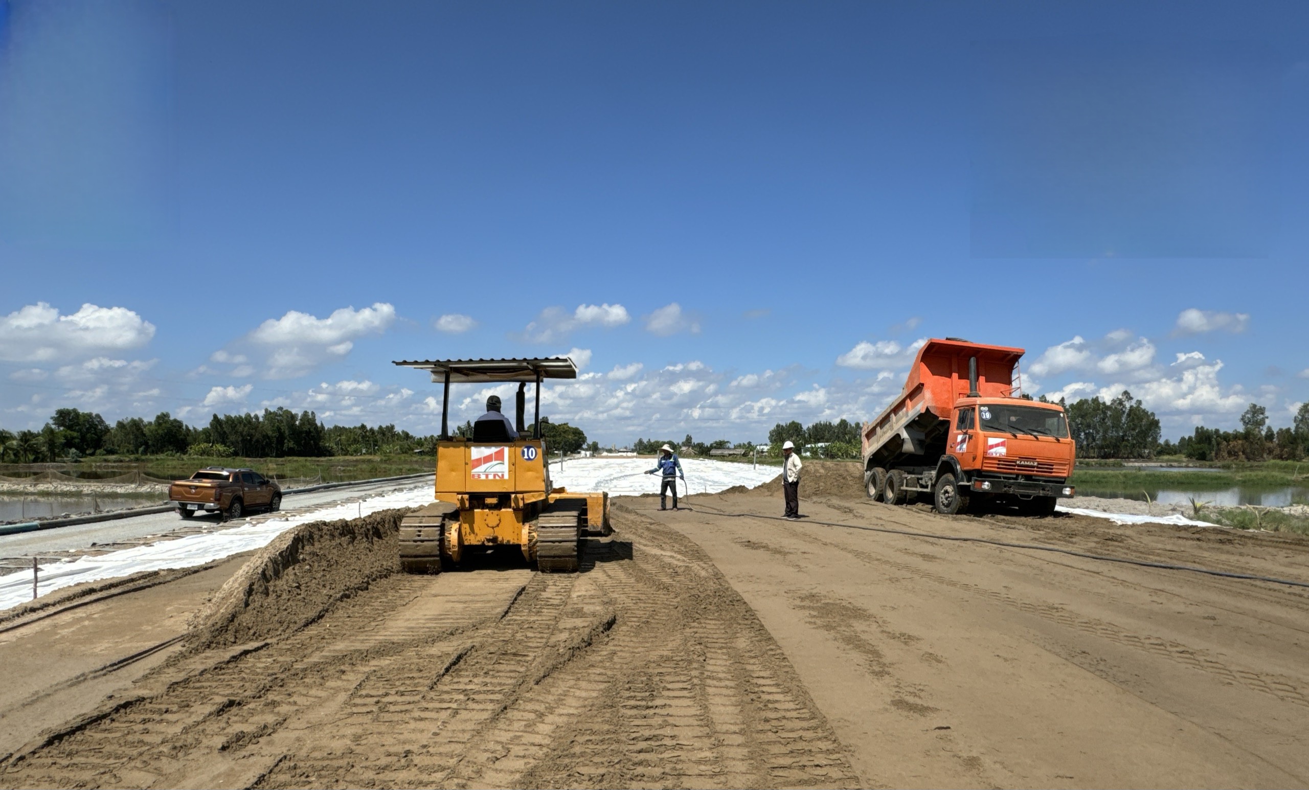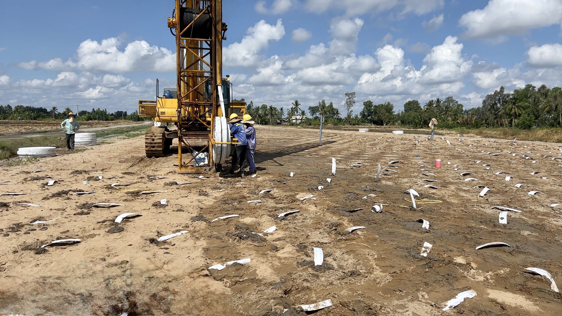 Tháng 4, miền Tây nắng gay gắt từ 36-40 độ, nhưng trên công trường cao tốc Cần Thơ - Cà Mau, các công nhân, kỹ sư vẫn làm việc liên tục.