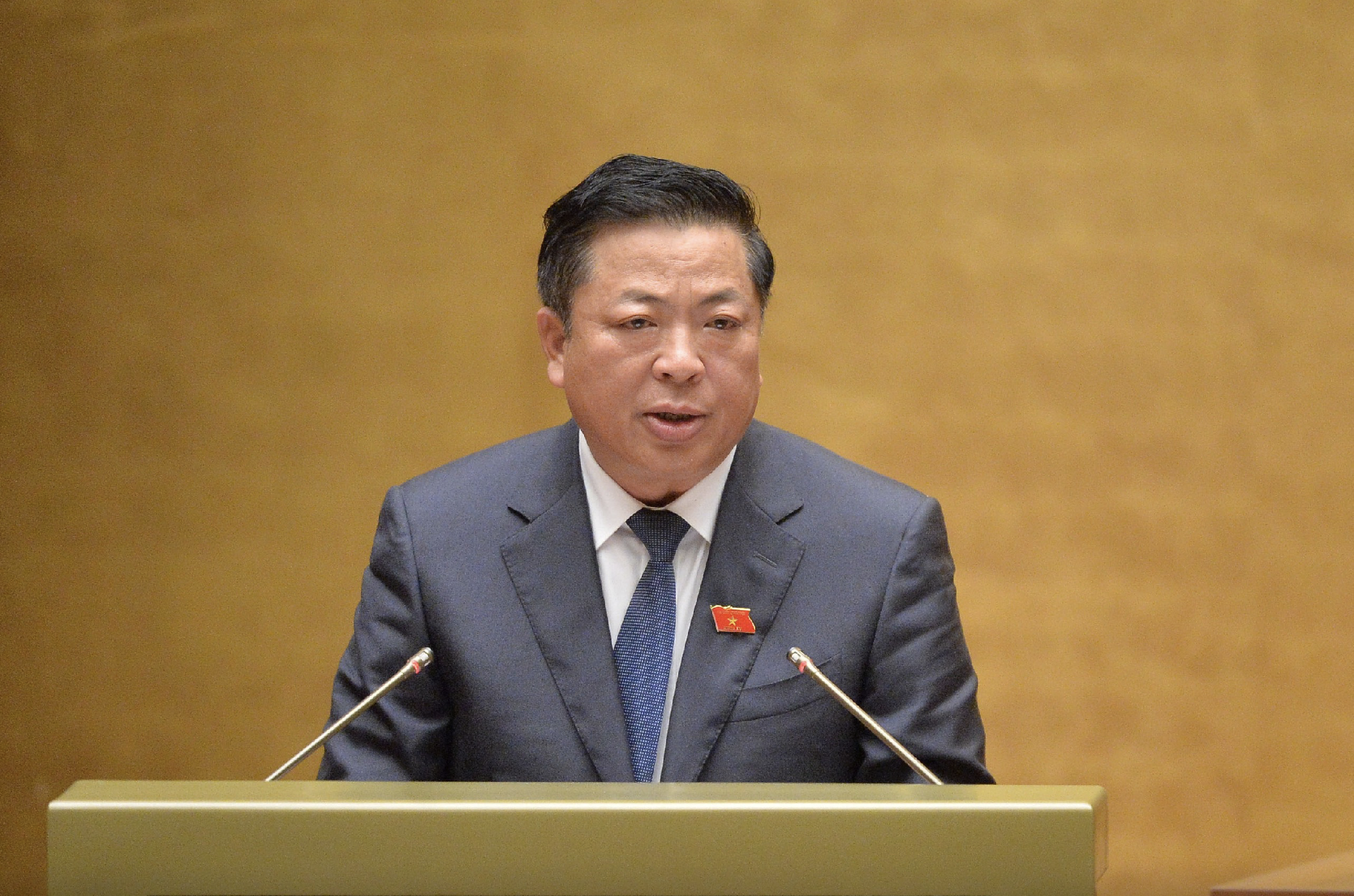 Bộ trưởng Bộ Xây dựng Trần Hồng Minh trình bày dự thảo Nghị quyết 201 thí điểm về một số cơ chế, chính sách đặc thù phát triển nhà ở xã hội tại Kỳ họp thứ 9 của Quốc hội. Ảnh: Media Quốc hội.