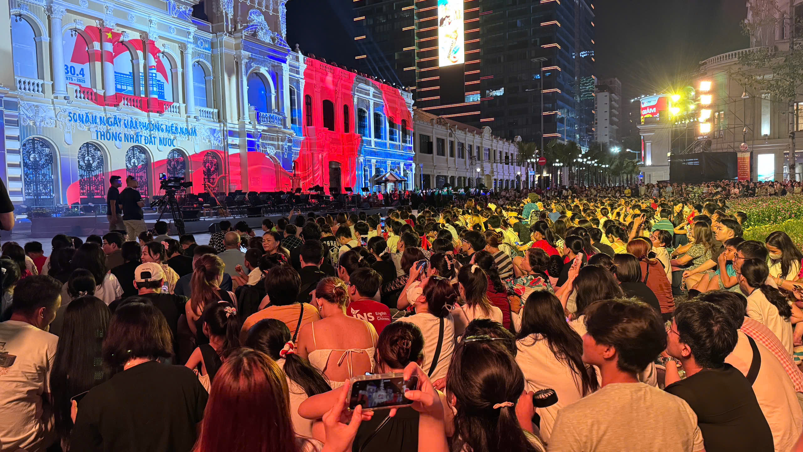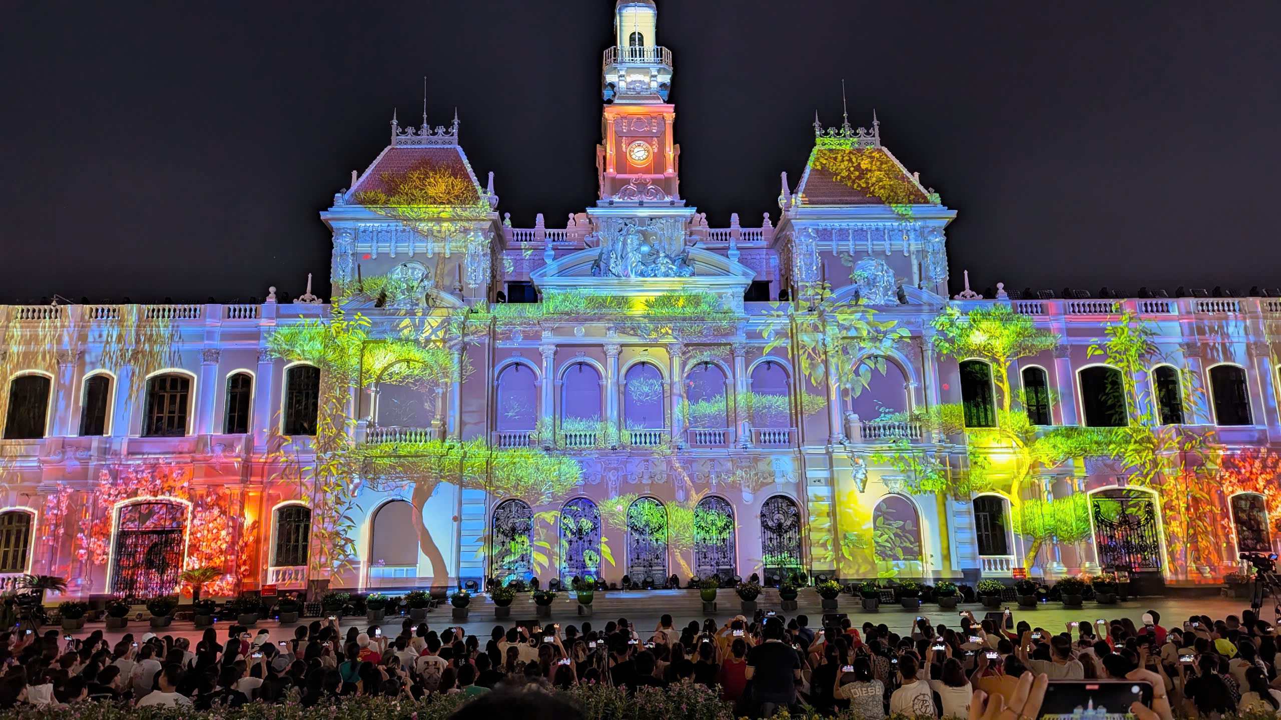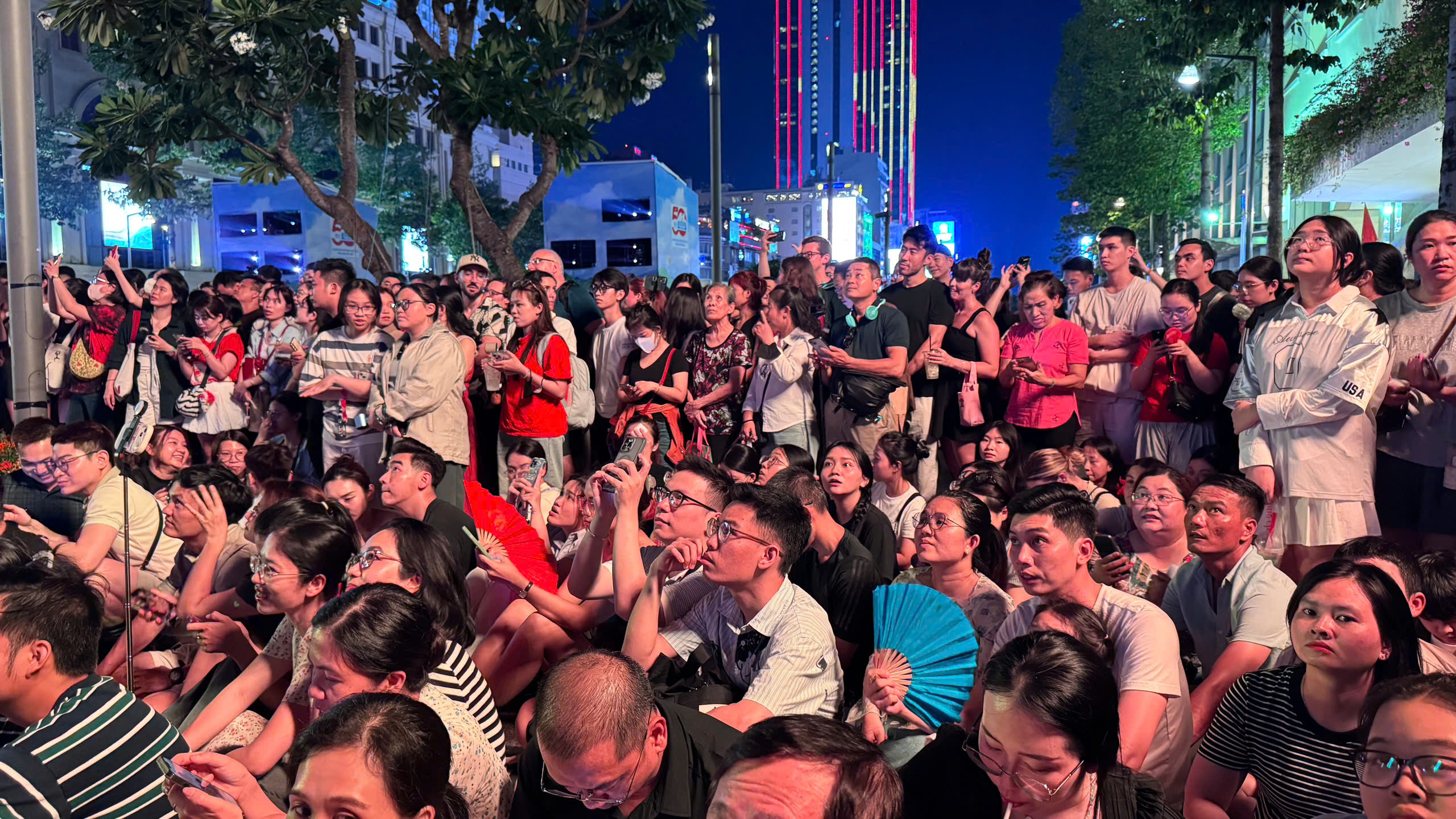 Đến khoảng 17h tối, khu vực trước trụ sở HĐND & UBND TP.HCM đã ken đặc người. Mặc dù thời tiết không quá nóng nực, nhưng do lượng người tập trung quá đông, không gian trở nên ngột ngạt và oi bức hơn thường lệ. Dù vậy, tất cả mọi người đều kiên nhẫn chờ đợi, tìm chỗ tốt nhất để có thể thưởng thức trọn vẹn bữa tiệc ánh sáng.