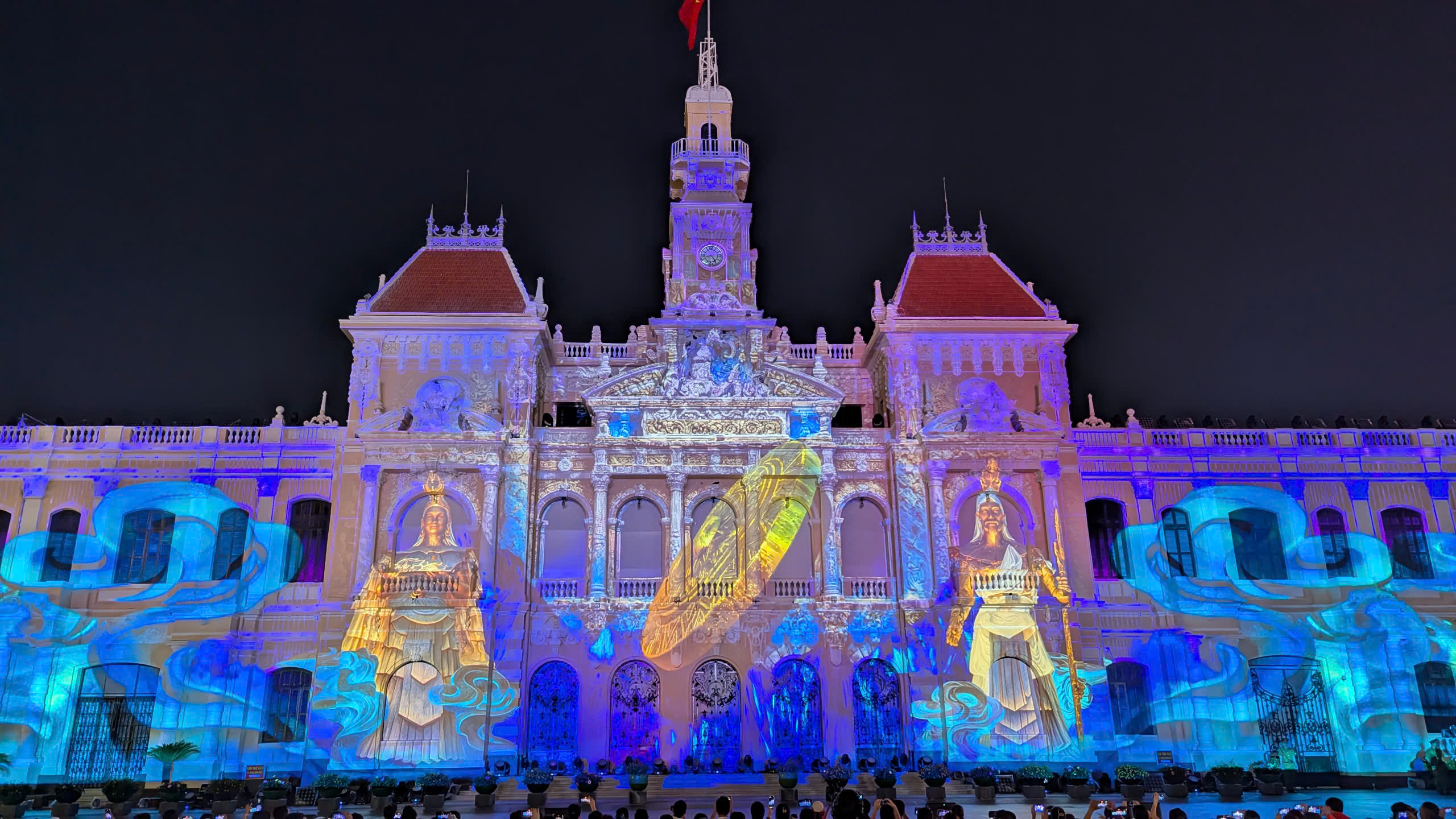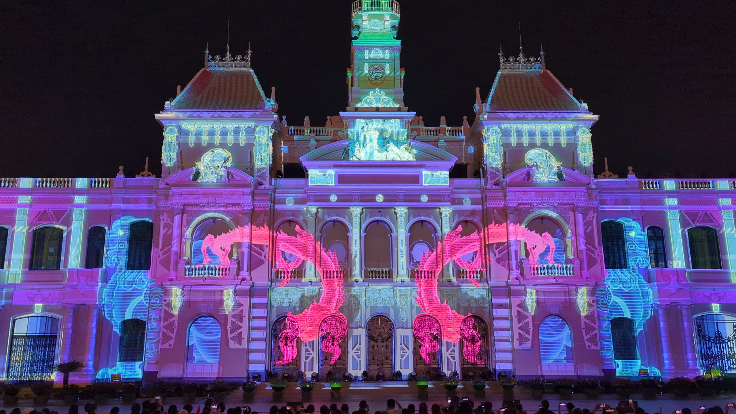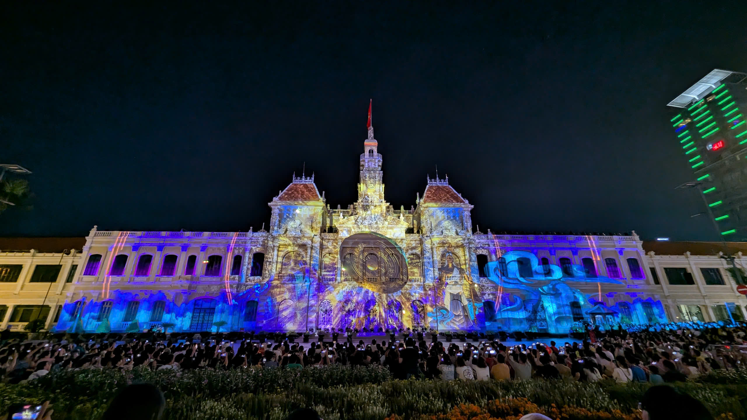 Những hình ảnh sống động, đầy màu sắc lần lượt hiện lên mặt tiền trụ sở HĐND & UBND TP.HCM, kết hợp cùng âm nhạc hùng tráng và hiệu ứng âm thanh, ánh sáng được lập trình tinh xảo.