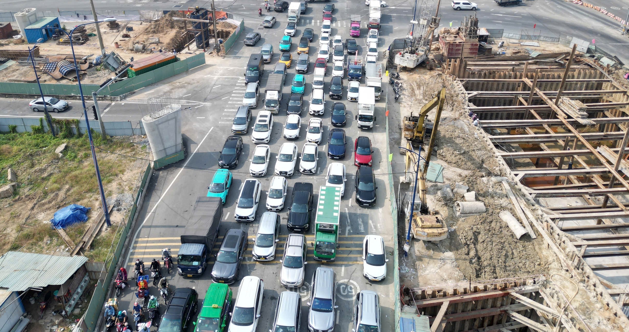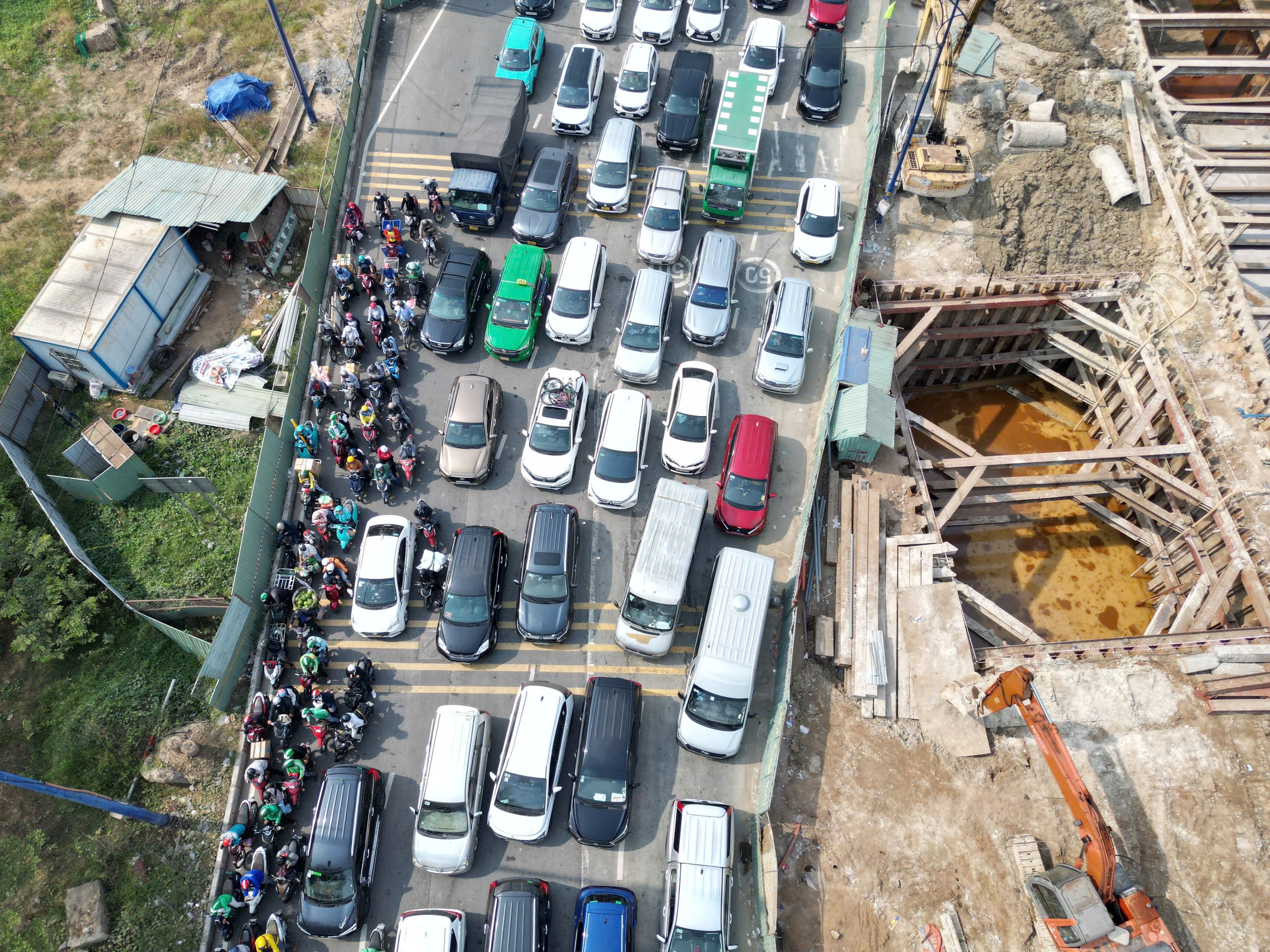 Nhiều thời điểm, các xe xếp thành 7 hàng dọc trên đường, nhích từng chút để tiến lên phía trước. Không chỉ nút giao An Phú bị kẹt cứng phương tiện, các tuyến đường lân cận như: Mai Chí Thọ, Lương Định Của, Đồng Văn Cống... cũng rơi vào tình cảnh tương tự.