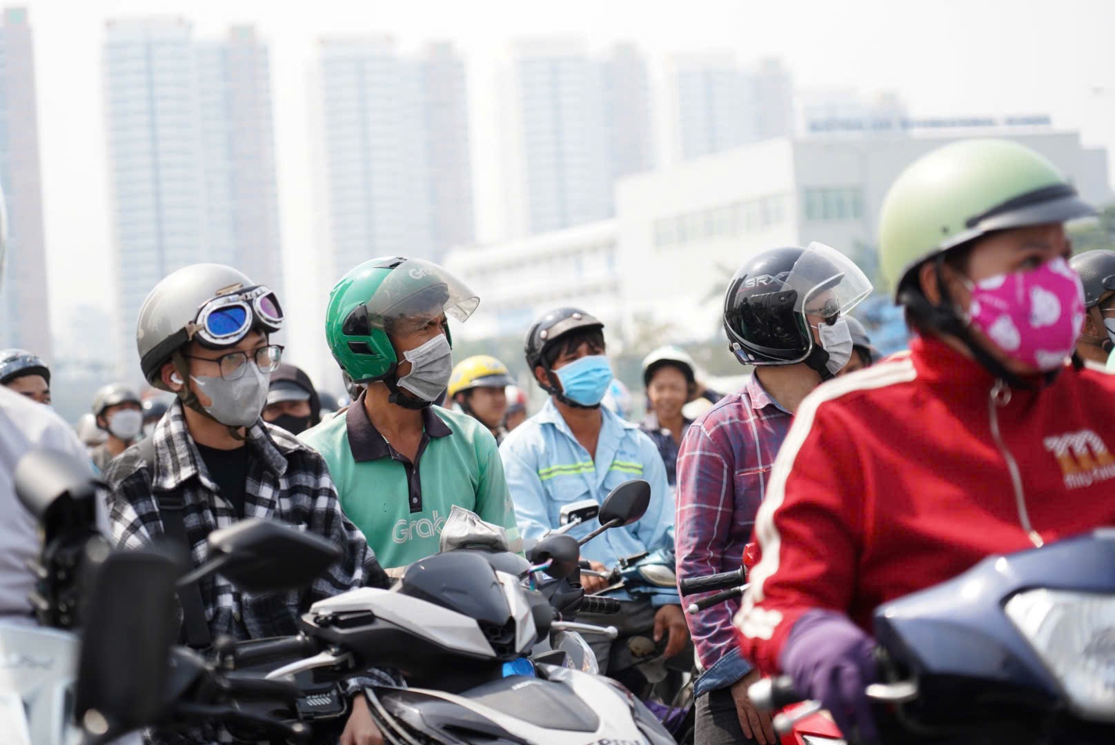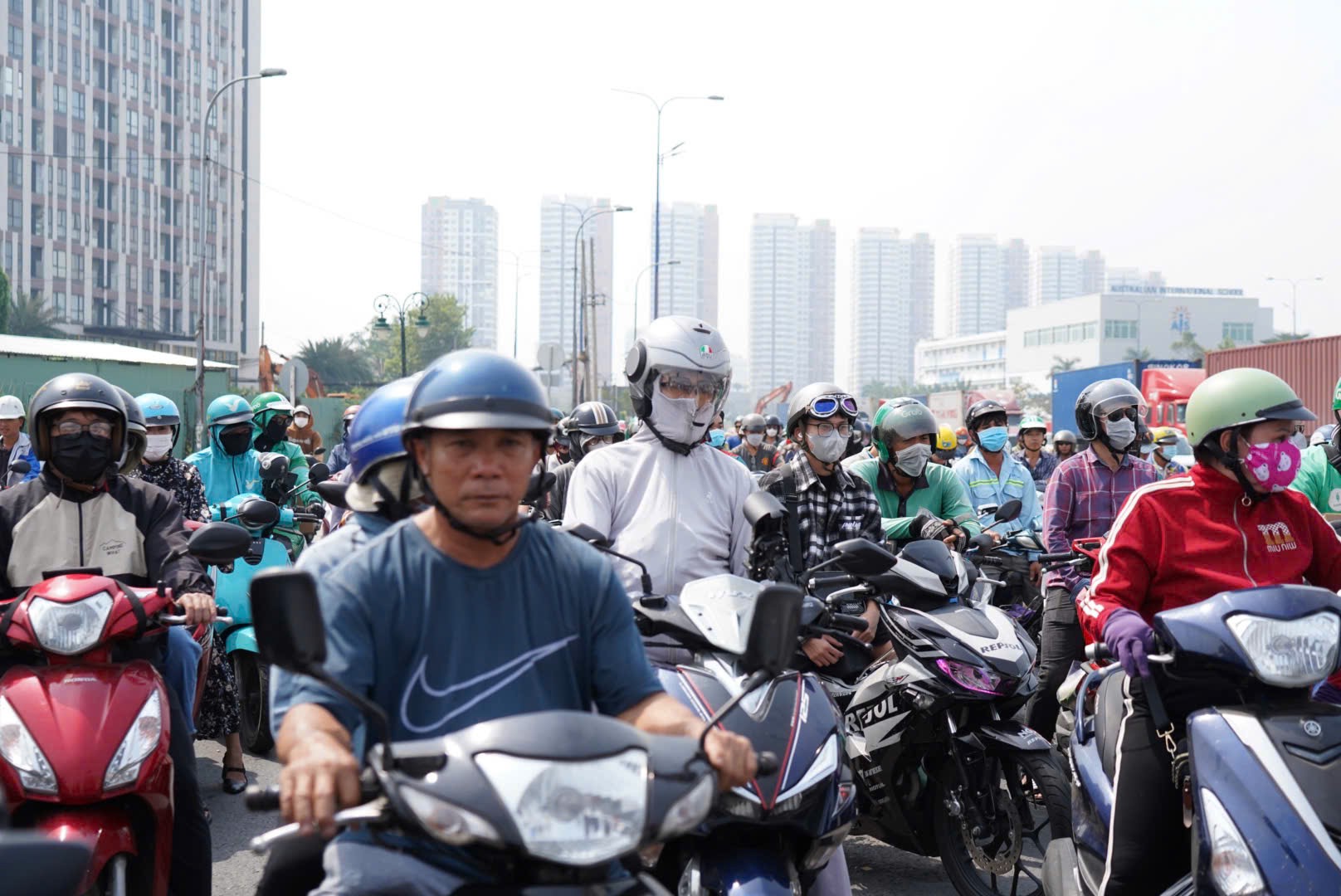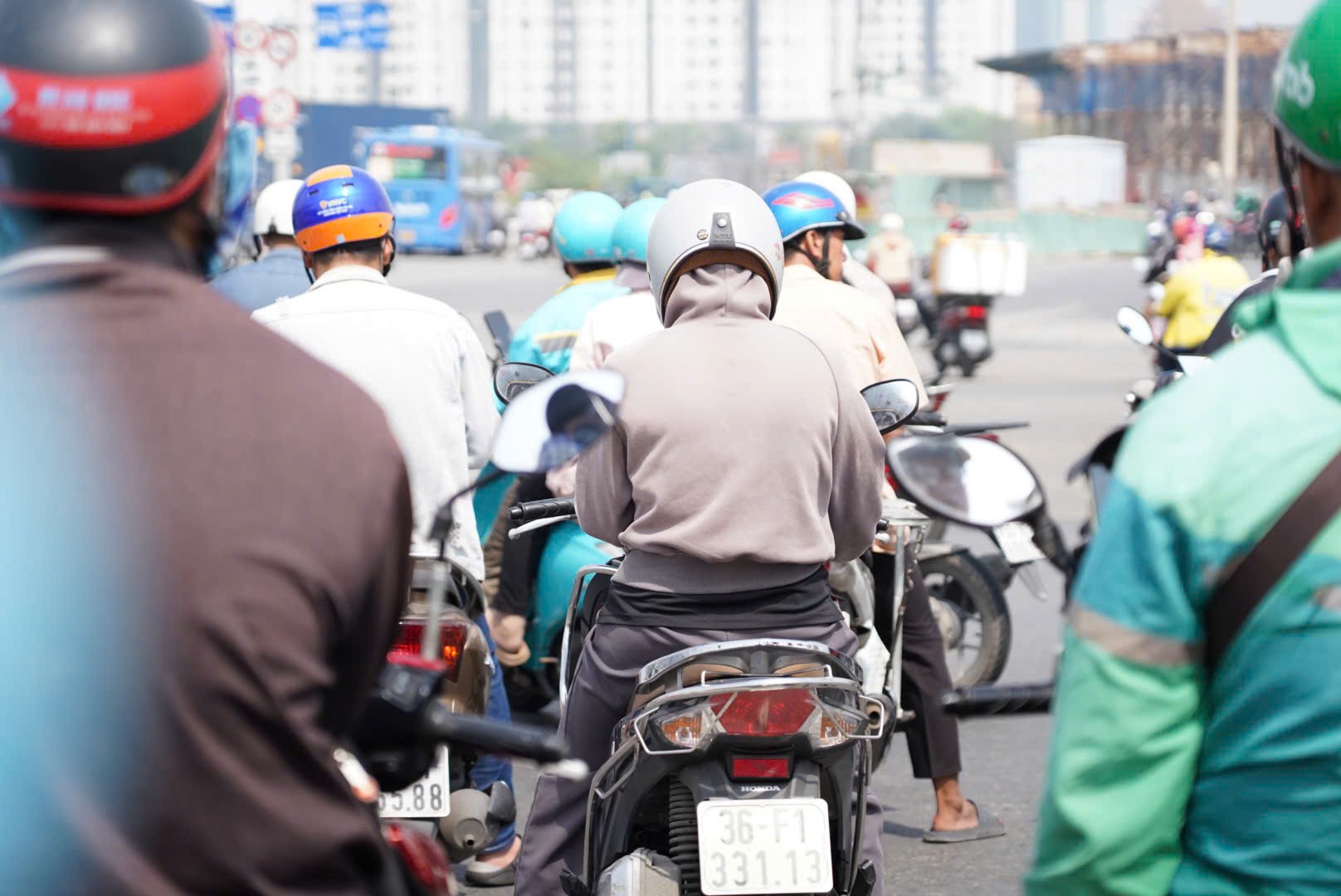 Ngoài xe ô tô, trong ngày hôm nay, người dân đi xe máy về quê ở cửa ngõ phía Đông cũng tăng mạnh. Xe cộ chen chúc, len lỏi giữa các dòng xe lớn để đi. Giữa thời tiết khá khó chịu của TP.HCM, người dân mòn mỏi chờ đợi đường thông thoáng để tiến về phía trước.