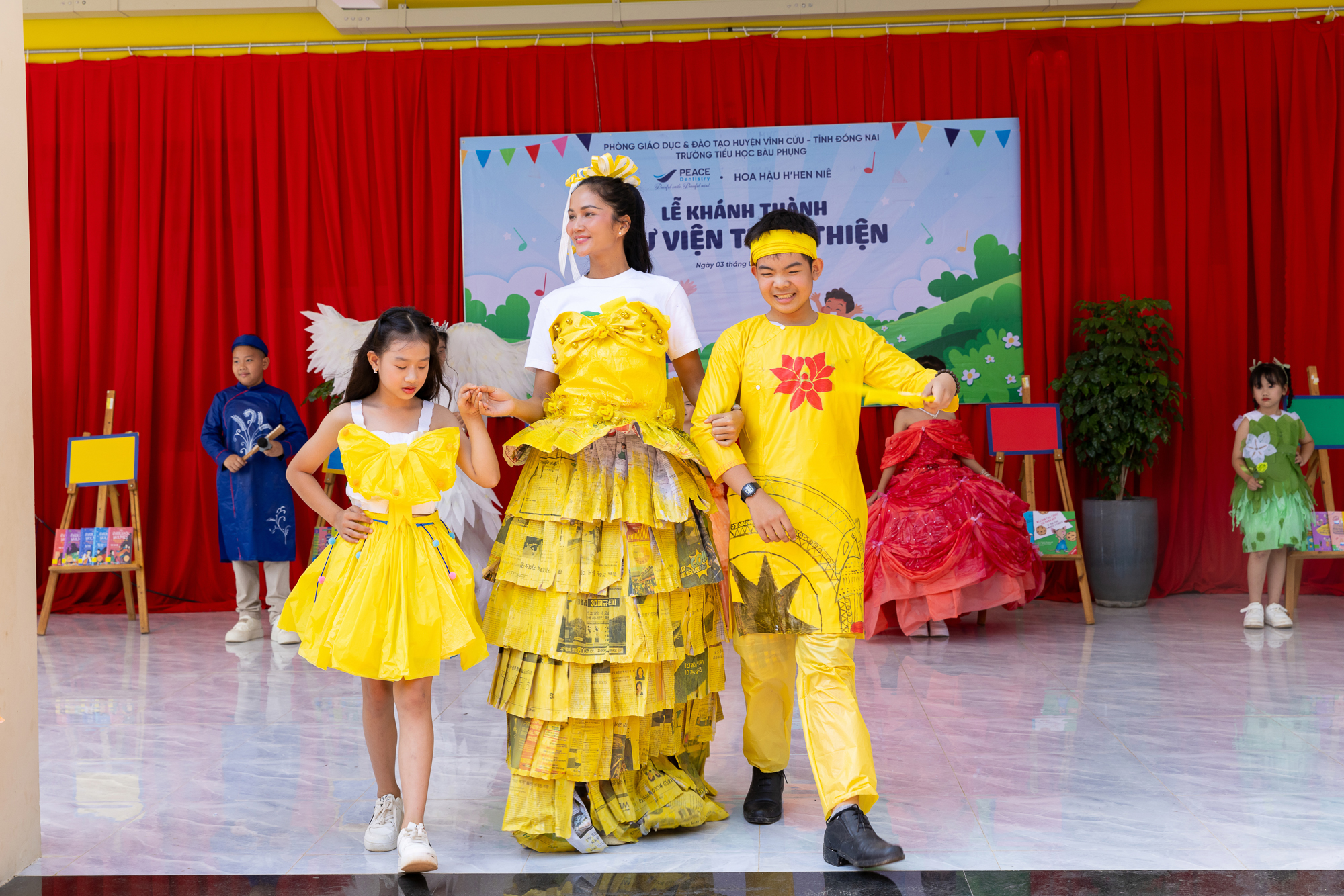 Đặc biệt, H’Hen Niê còn trình diễn cùng các em học sinh trong phần “Thời trang mã màu” hướng dẫn việc chọn sách theo mã màu từng khối lớp khi vào tham quan thư viện.