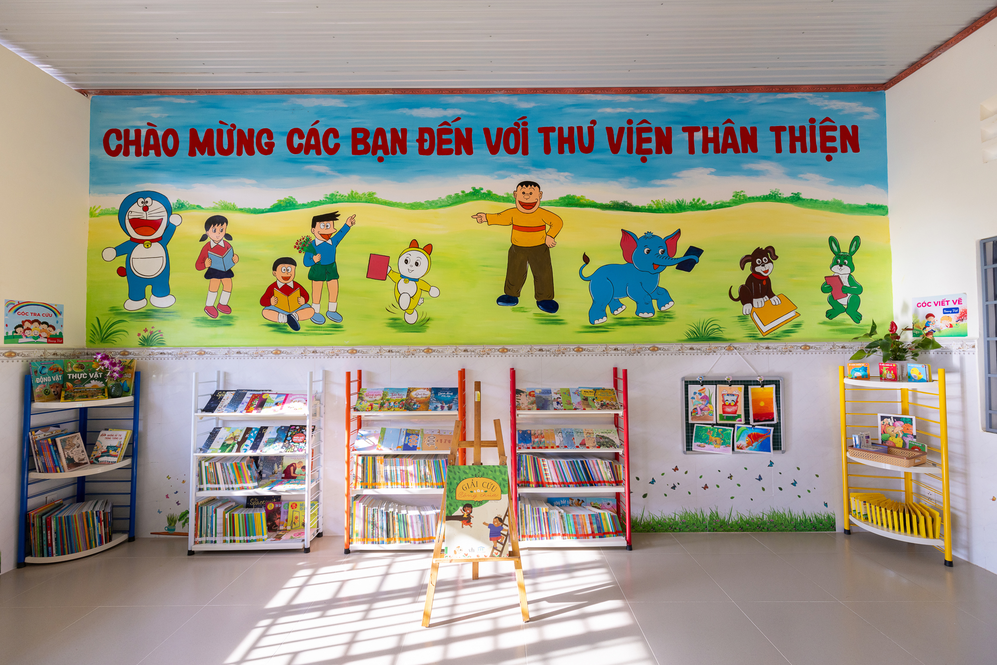 Vẫn như 11 thư viện thân thiện trước, thư viện mới đảm bảo không gian thư viện được trang trí bằng những hình vẽ hoạt hình màu sắc, các tủ sách được bố trí theo từng khối lớp với các mã màu phân biệt.