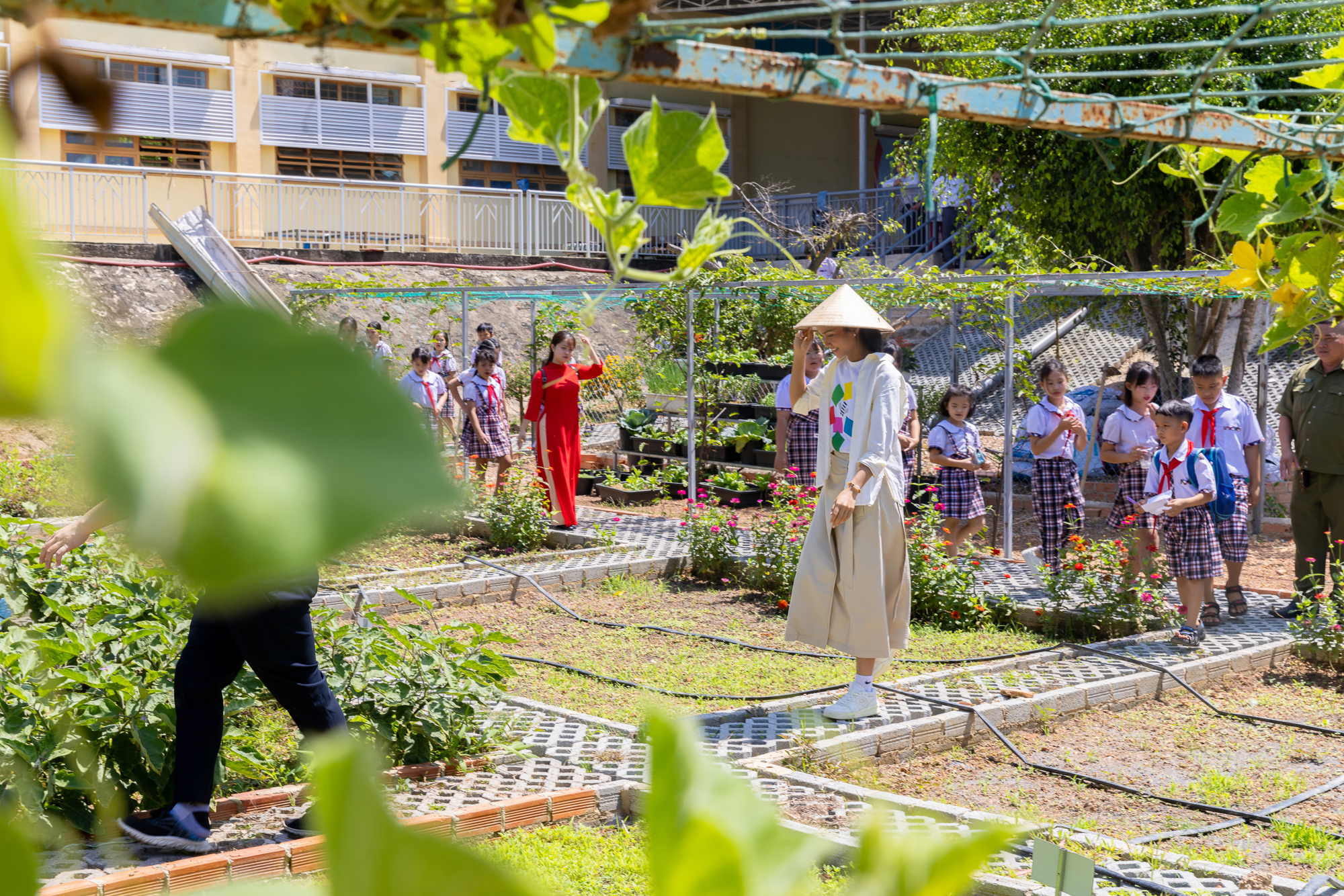Trước khi ra về, H’Hen Niê vào thăm vườn rau do các em học sinh trồng, được chia khu theo lớp. Hoa hậu đặc biệt thích khu trồng cà pháo và cùng các em thu hoạch.