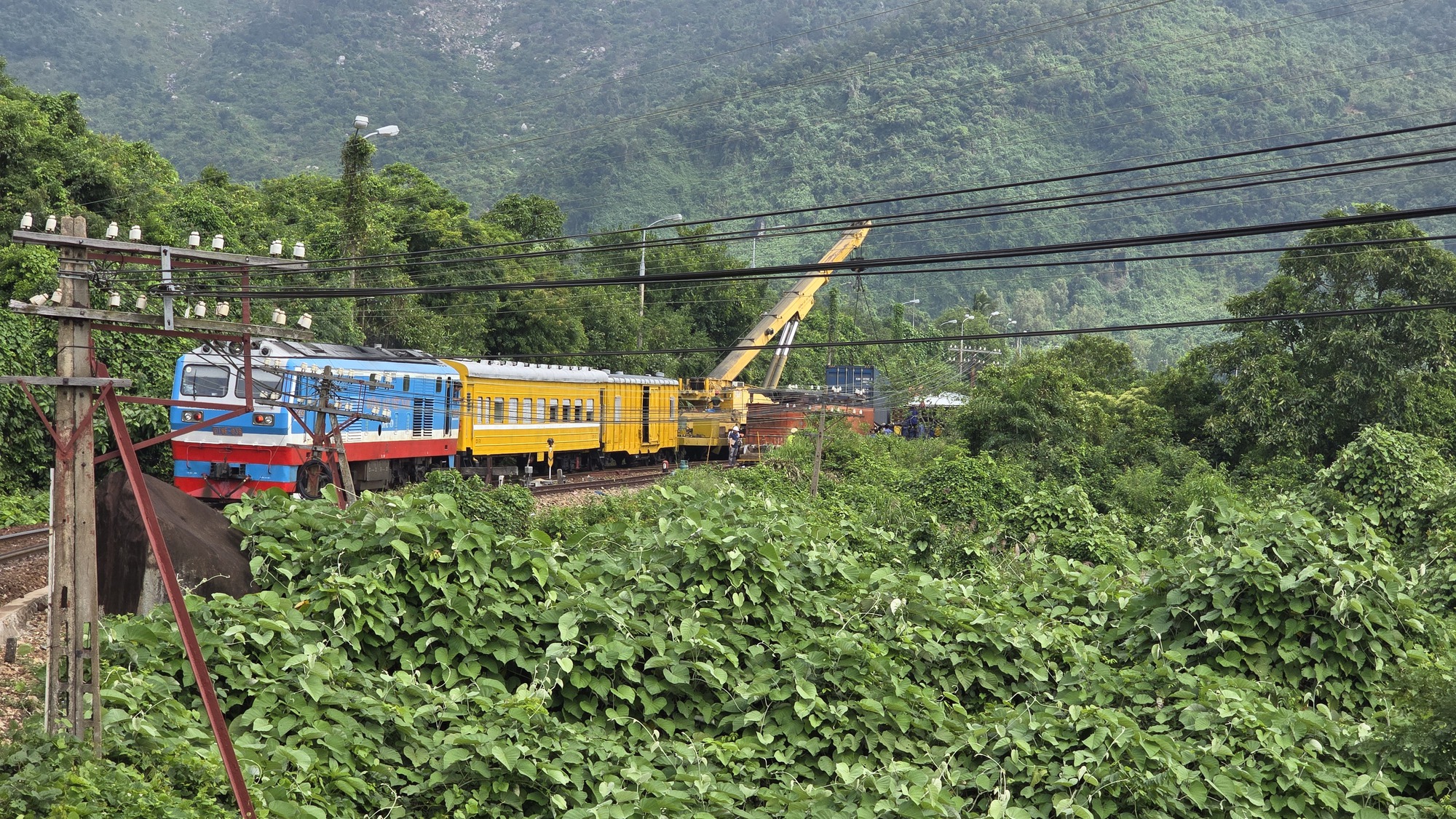 Hiện tuyến đường sắt qua đèo Hải Vân vẫn còn ách tắc giao thông.