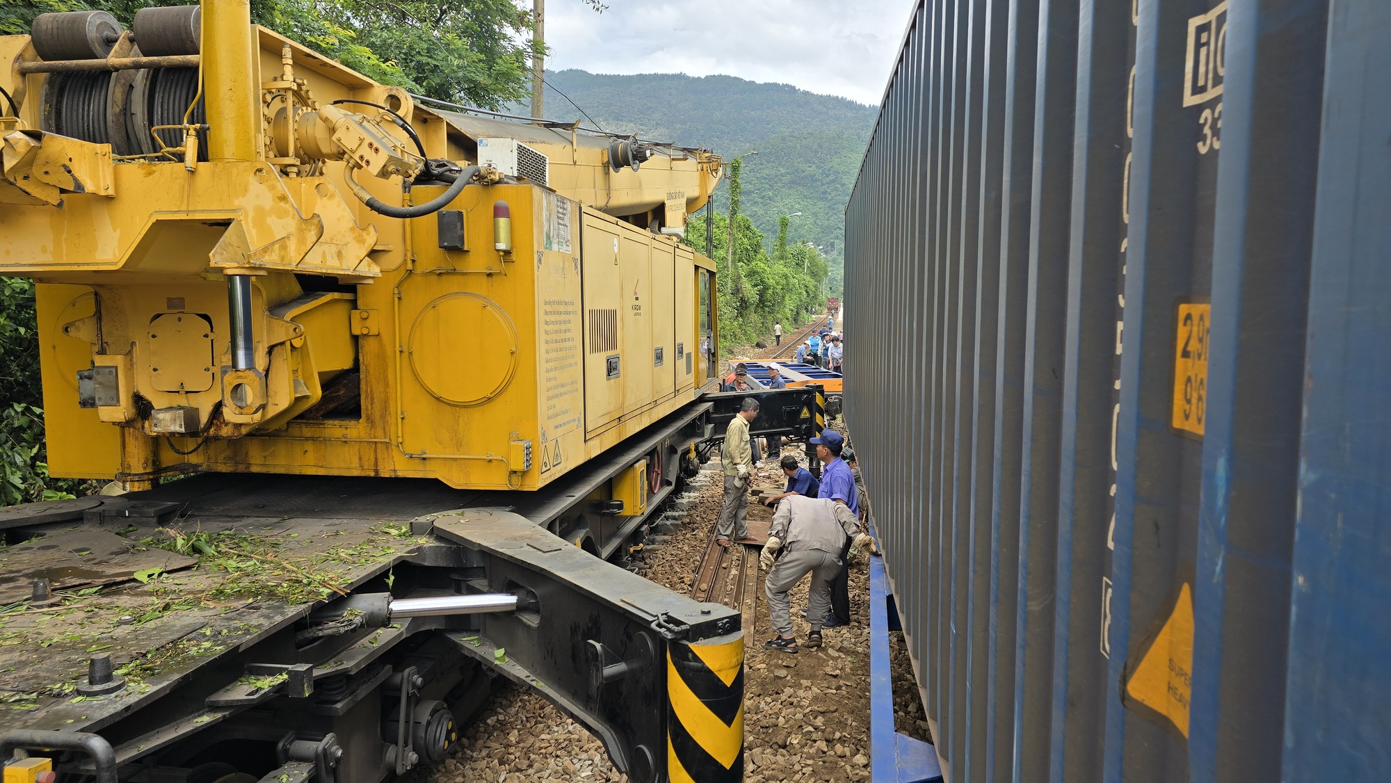 Ngành đường sắt đã huy động xe cẩu chuyên dụng cùng hàng chục công nhân, kỹ thuật túc trực tại hiện trường xử lý sự cố.