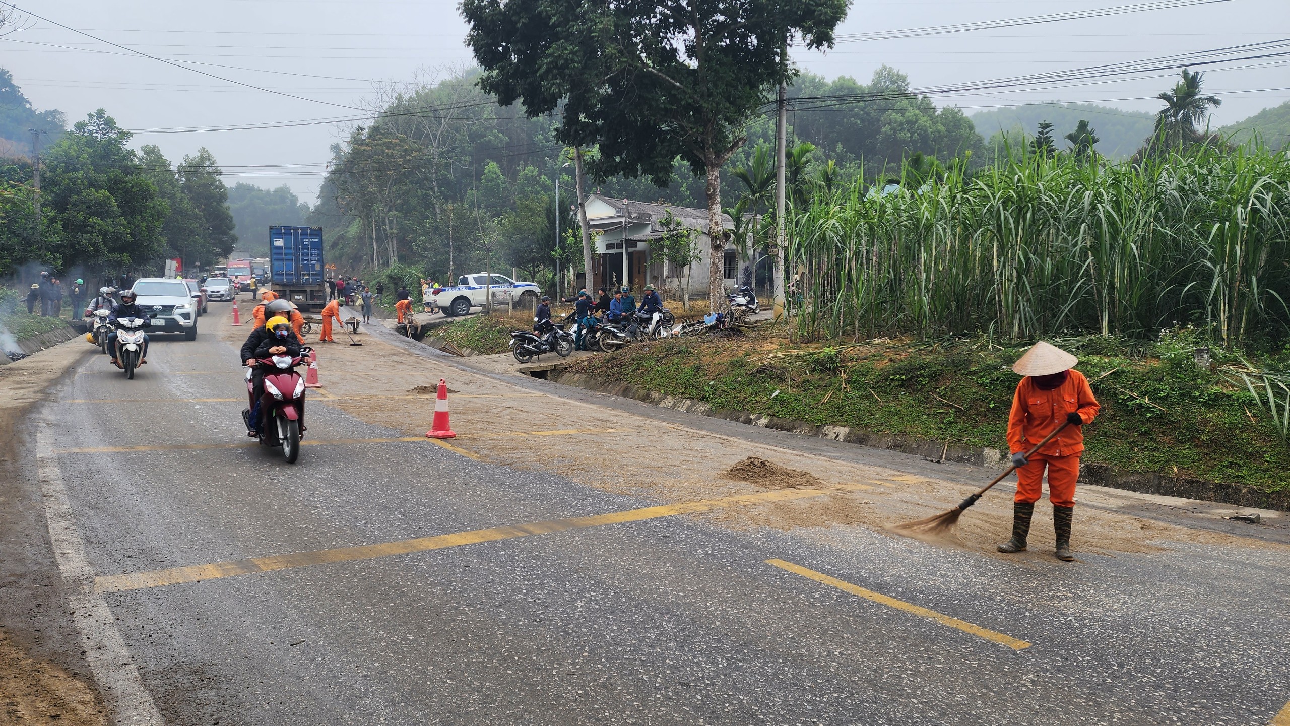 Đơn vị quản lý đường bộ dùng cát khô để xử lý dầu tràn trên mặt đường.
