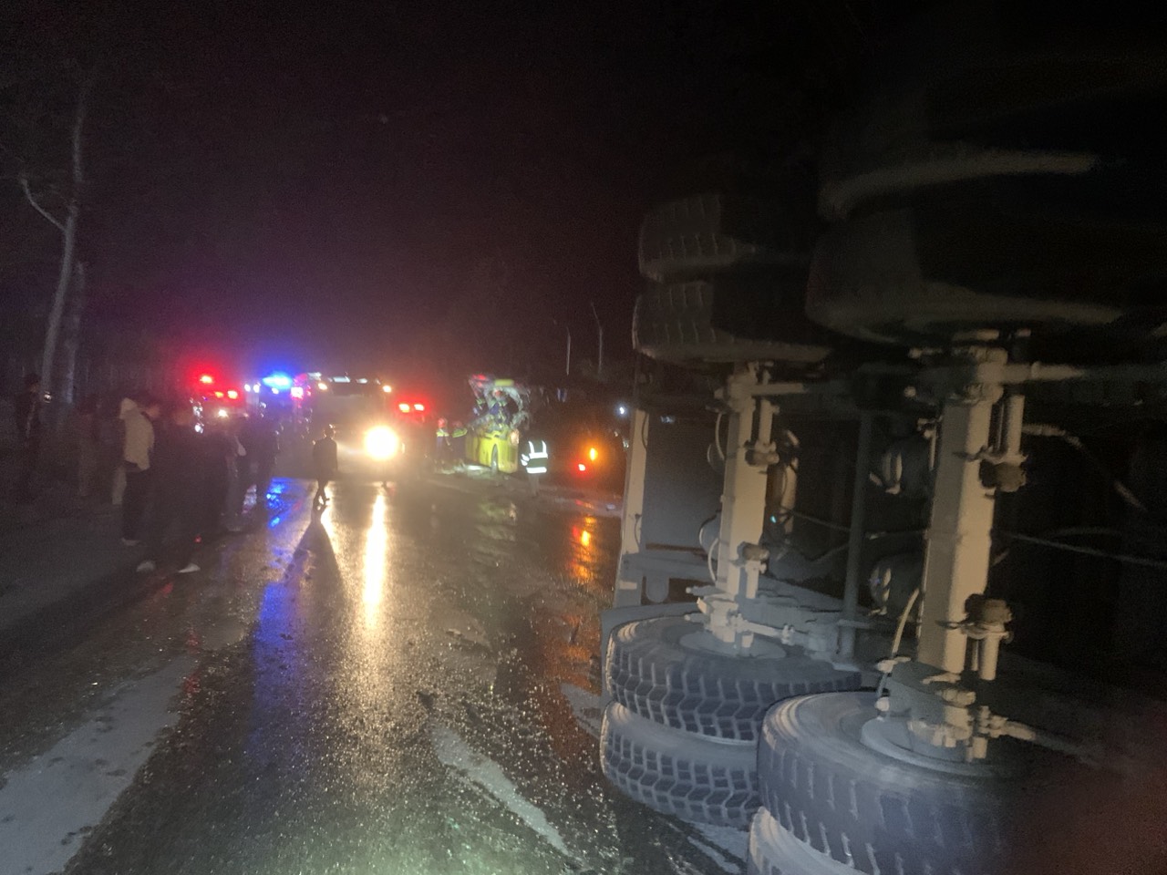 Xe đầu kéo lật nghiêng sau vụ tai nạn. Danh tính các nạn nhân tử vong được xác định là: L.H.H.Q (SN 1989, trú tại xã Bình Hòa, huyện Thuận An, tỉnh Bình Dương); V.T.M.T (SN 1998, trú tại xã Tân Thành, huyện Tân Hiệp, tỉnh Kiên Giang); V.H.C (SN 1987, trú tại xã Thụy Văn, huyện Thái Thụy, tỉnh Thái Bình); T.N.T.D.V (SN 2000, trú tại thị xã Điện Bàu, tỉnh Quảng Nam) và V.C.C (SN 1987, trú tại xã Mỹ An, huyện Thạch Phú, tỉnh Bến Tre).