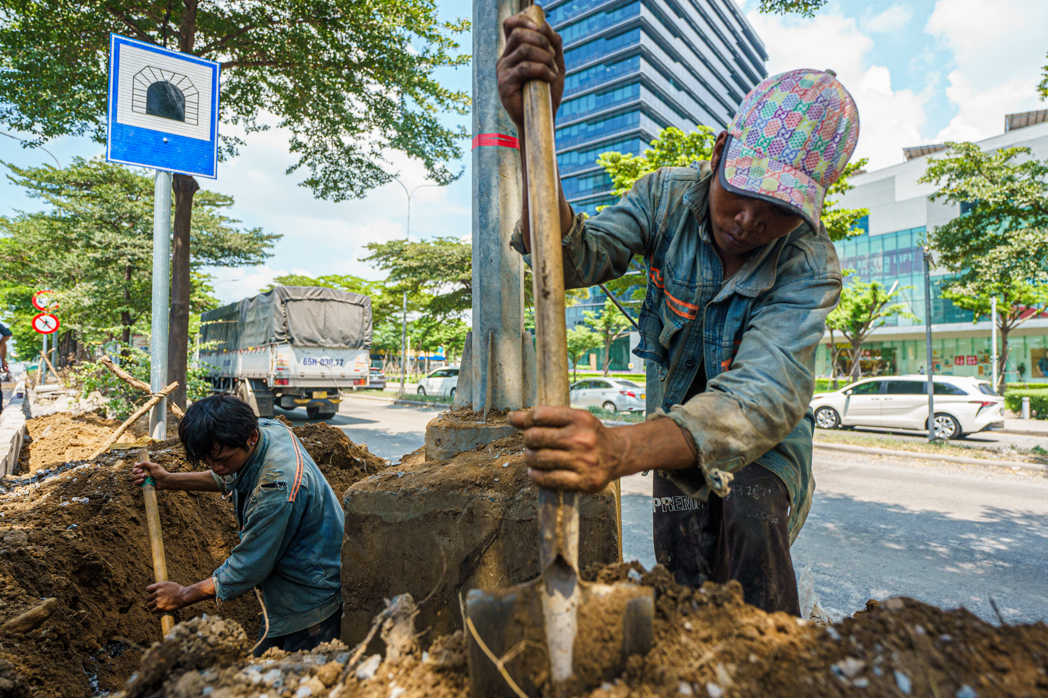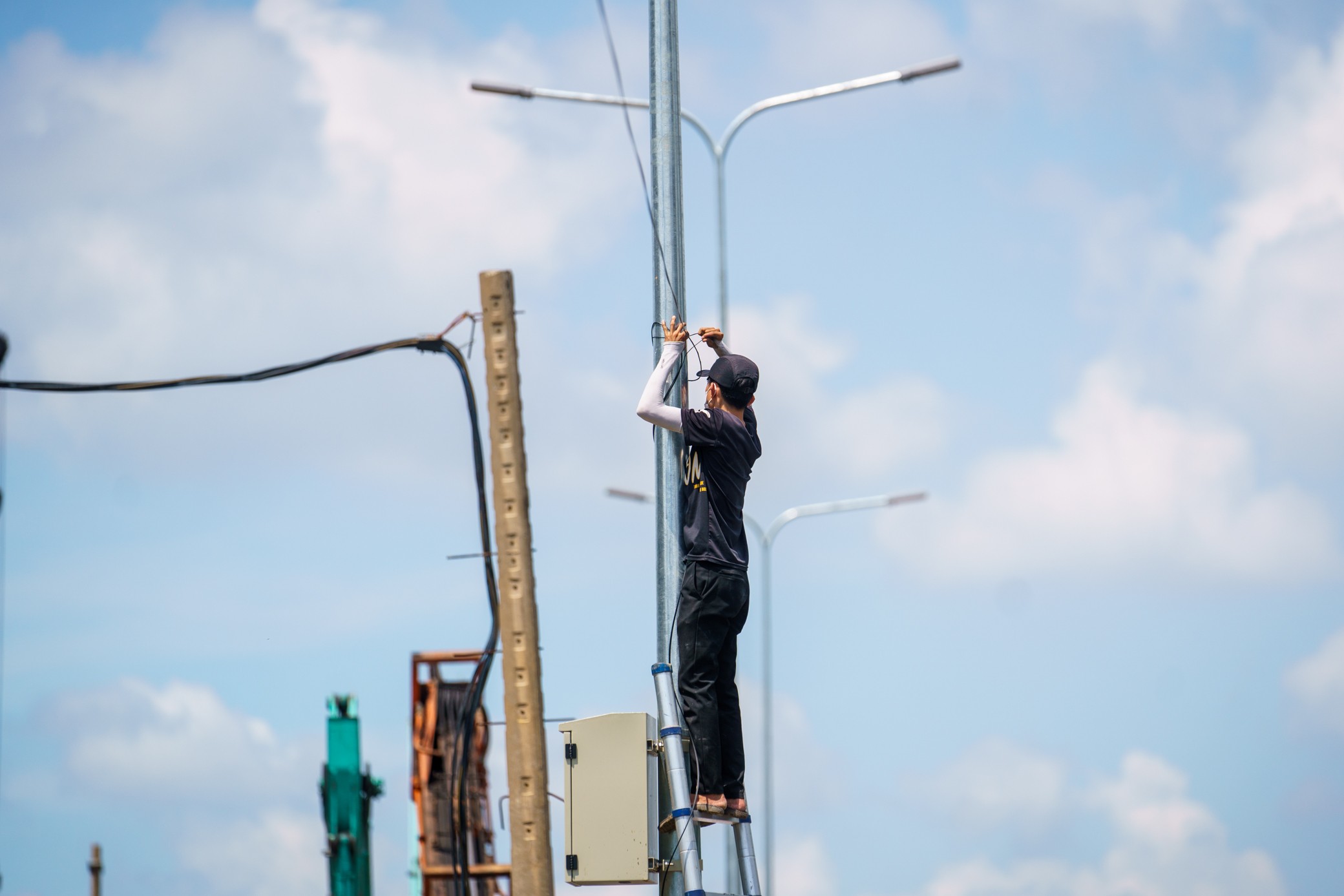 Nhóm công nhân đang hoàn thiện lắp đặt trụ đèn đường cuối phía bên ngoài đường dẫn.