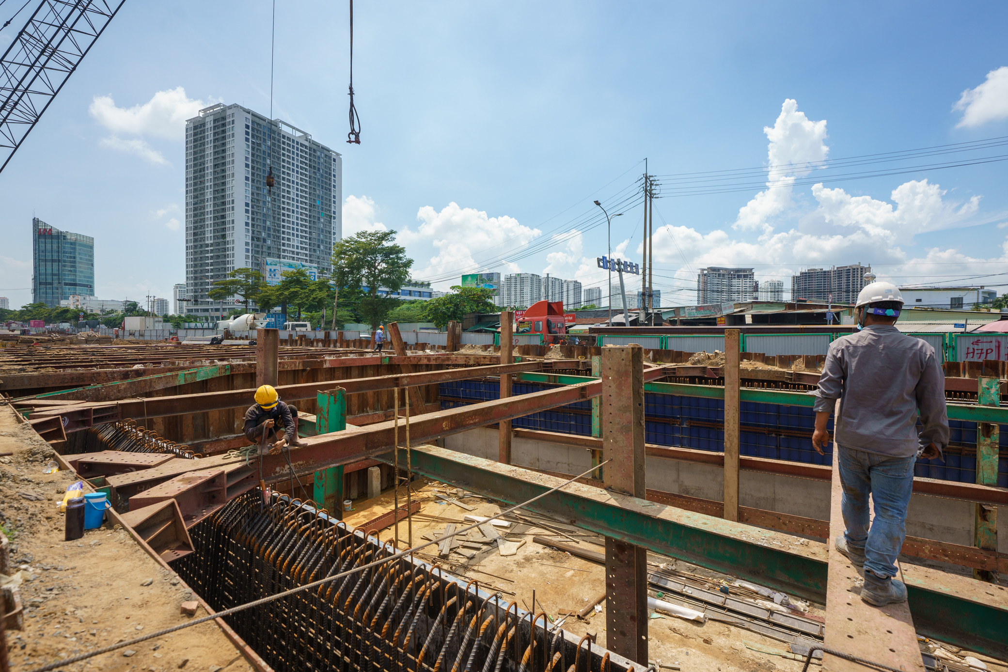 Trên công trường, hàng chục kỹ sư, công nhân, cùng nhiều loại máy móc, thiết bị tấp nập thi công. Chủ đầu tư cũng sẽ đẩy nhanh tiến độ dự án để thông xe nhánh hầm còn lại (HC1) trước ngày 31/12 năm nay.