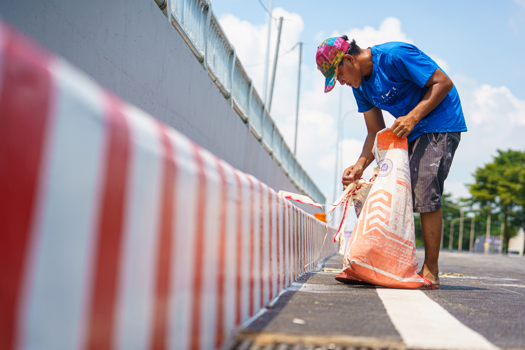Anh Nguyễn Trọng Tiến, công nhân trên công trường đang thu dọn dần rác công trình, chuẩn bị cho ngày thông xe.