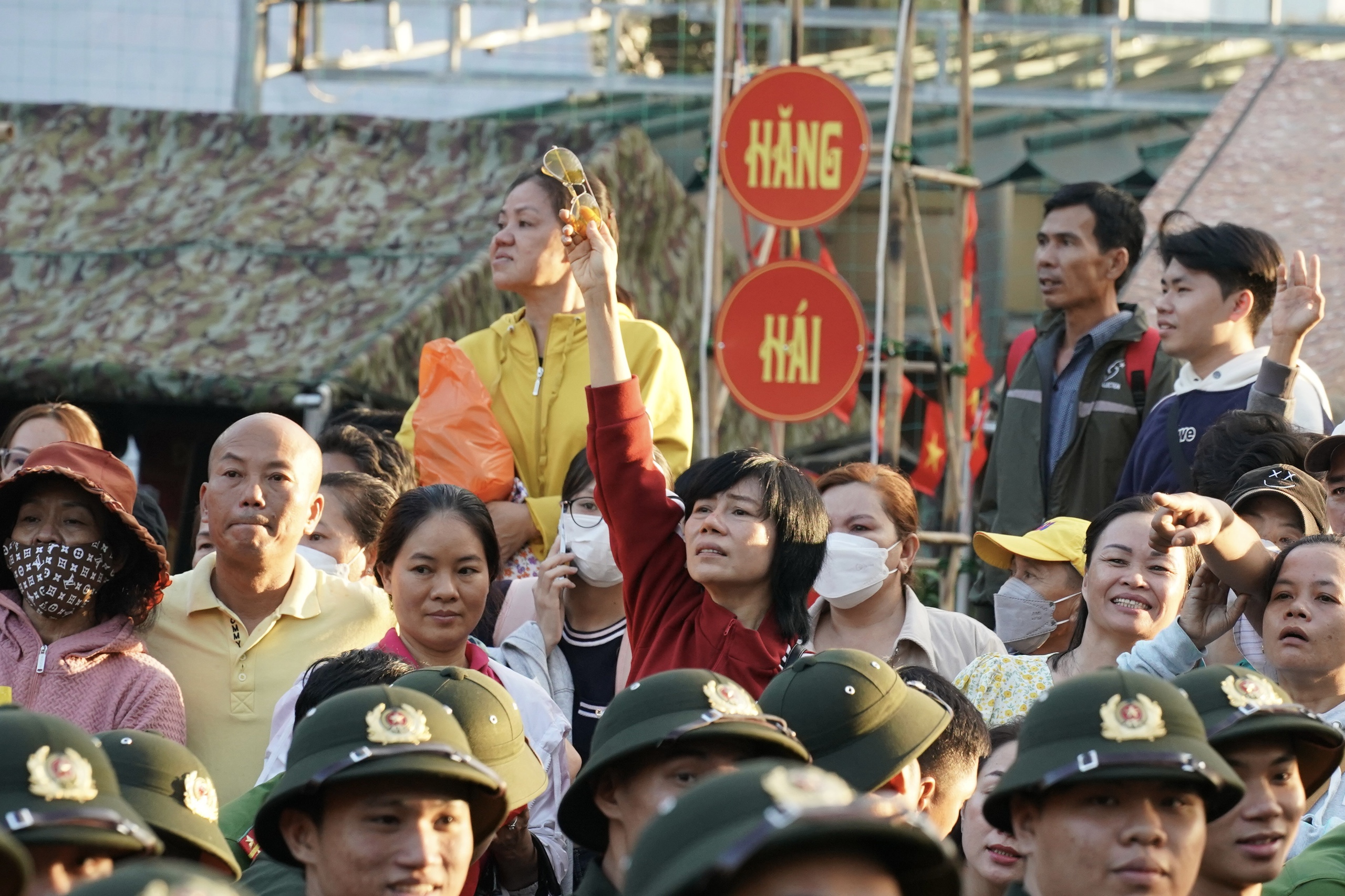 Các bậc phụ huynh không ngừng vẫy tay, hướng mắt tìm kiếm con trong hàng nghìn thanh niên nhập ngũ. Chị Đỗ Thị Thịnh (TP Thủ Đức) xúc động khi đến tiễn con trai. Chị cho biết con trai chị tự nguyện viết đơn để xin tham gia nhập ngũ. "Khi biết tin, gia đình rất tự hào vì con được vào môi trường quân đội để rèn luyện và cống hiến cho Tổ quốc", chị Thịnh chia sẻ.