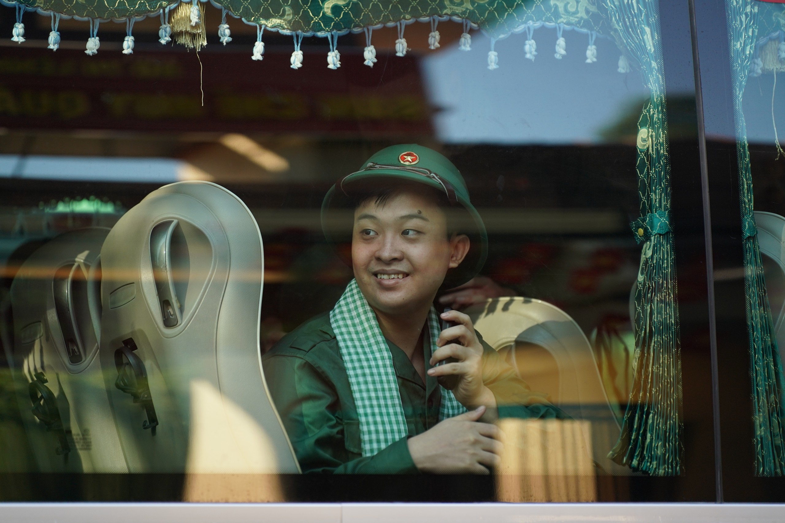 Nụ cười tươi rói của một thanh niên lên đường nhập ngũ sau khi chào tạm biệt người thân.
