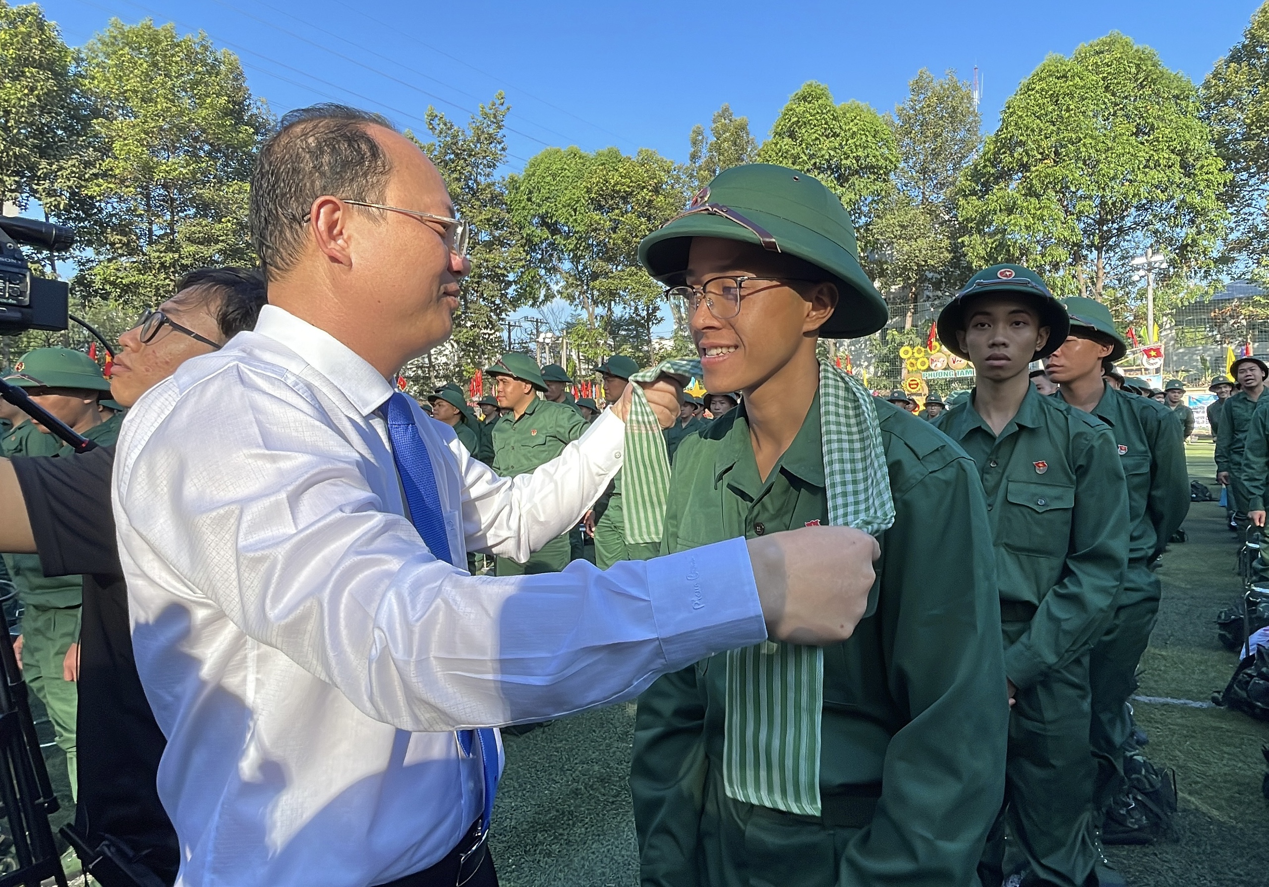 Phó Bí thư Thường trực Thành ủy TP.HCM Nguyễn Hồ Hải quàng khăn, động viên các thanh niên TP lên đường nhập ngũ.