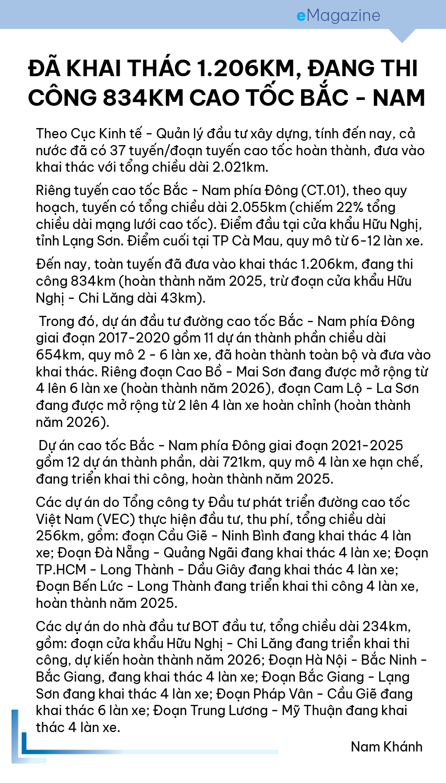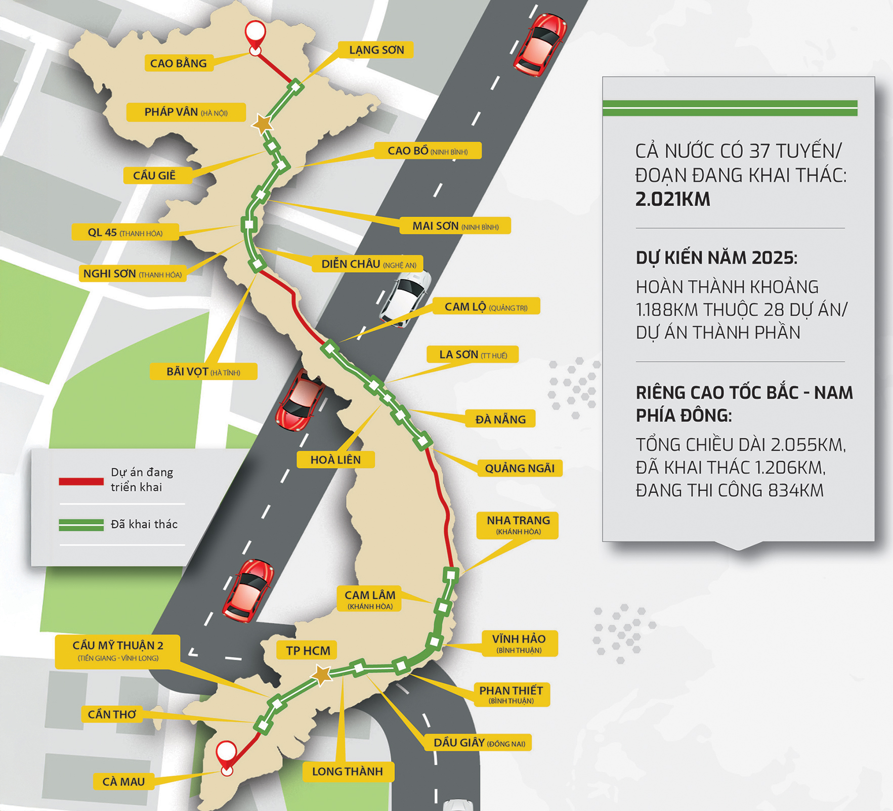 Toàn tuyến cao tốc Bắc – Nam đã đưa vào khai thác 1.206km, đang thi công 834km (hoàn thành năm 2025, trừ đoạn cửa khẩu Hữu Nghị - Chi Lăng dài 43km). Đồ họa: Nguyễn Tường.