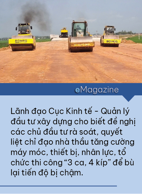Cục Kinh tế - Quản lý đầu tư xây dựng đề nghị các chủ đầu tư rà soát, quyết liệt chỉ đạo nhà thầu tăng cường máy móc, thiết bị, nhân lực, tổ chức thi công "3 ca, 4 kíp" để bù lại tiến độ bị chậm, đặc biệt tại các dự án: Quảng Ngãi - Hoài Nhơn; Chí Thạnh - Vân Phong; Dự án thành phần 2 cao tốc Biên Hòa - Vũng Tàu; Dự án Lộ Tẻ - Rạch Sỏi; Dự án đoạn Cần Thơ - Hậu Giang, Hậu Giang - Cà Mau.
