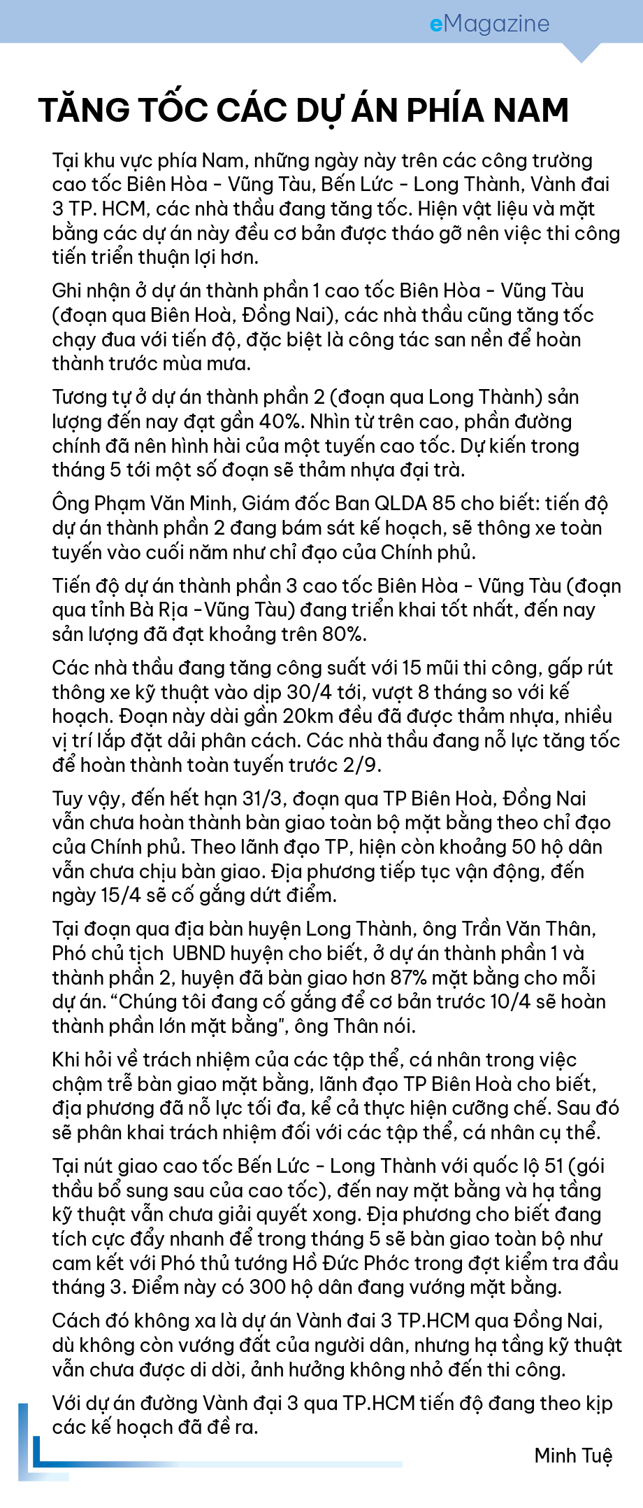Dự án Cao Lãnh - Lộ Tẻ mới bàn giao 95% mặt bằng; Dự án Bến Lức - Long Thành còn vướng khu vực nút giao QL51 mới bổ sung; Dự án Hòa Liên - Túy Loan vướng khoảng 0,5km đường gom, đường ngang, địa phương đang tập trung giải quyết, xử lý.