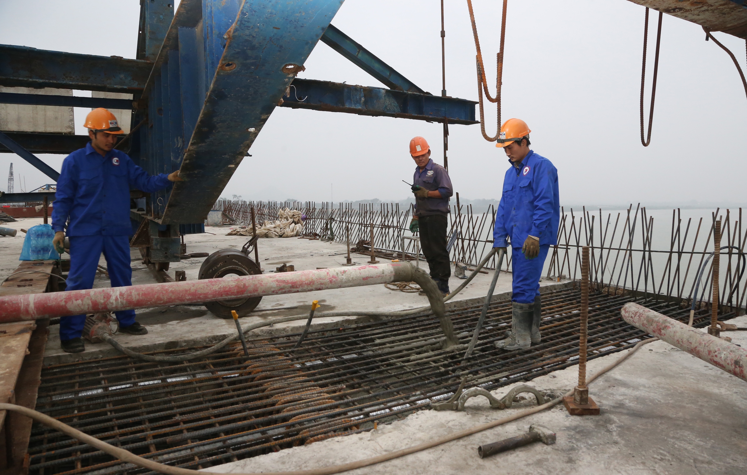 Riêng về phần thi công đúc hẫng, Công ty TNHH Hòa Hiệp và Công ty CP Tập đoàn Cienco 4 đã thi công xong các khối hợp long. (Hình ảnh công nhân Hòa Hiệp đổ mẻ bê tông cuối cùng hợp long nhịp T16-T17).