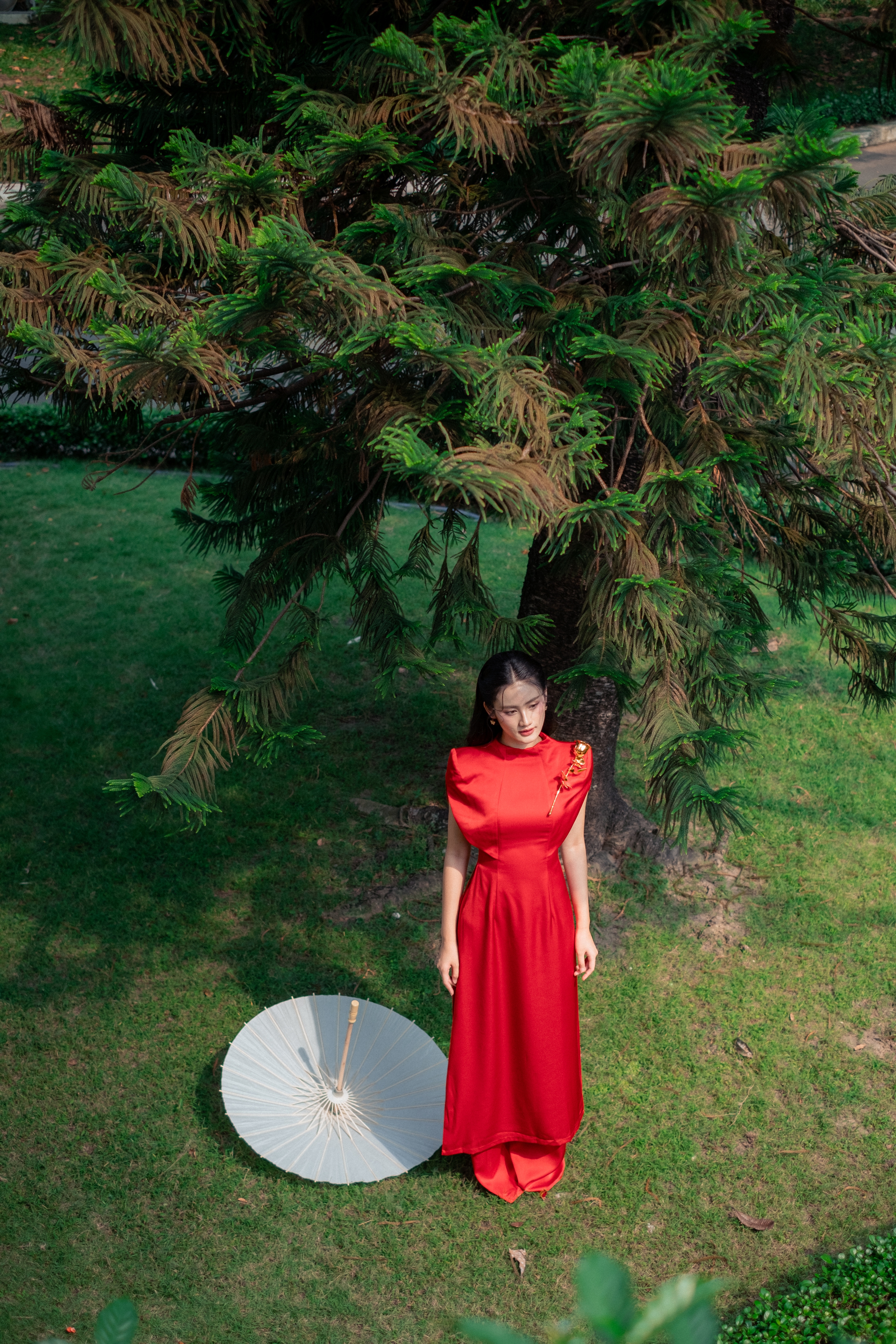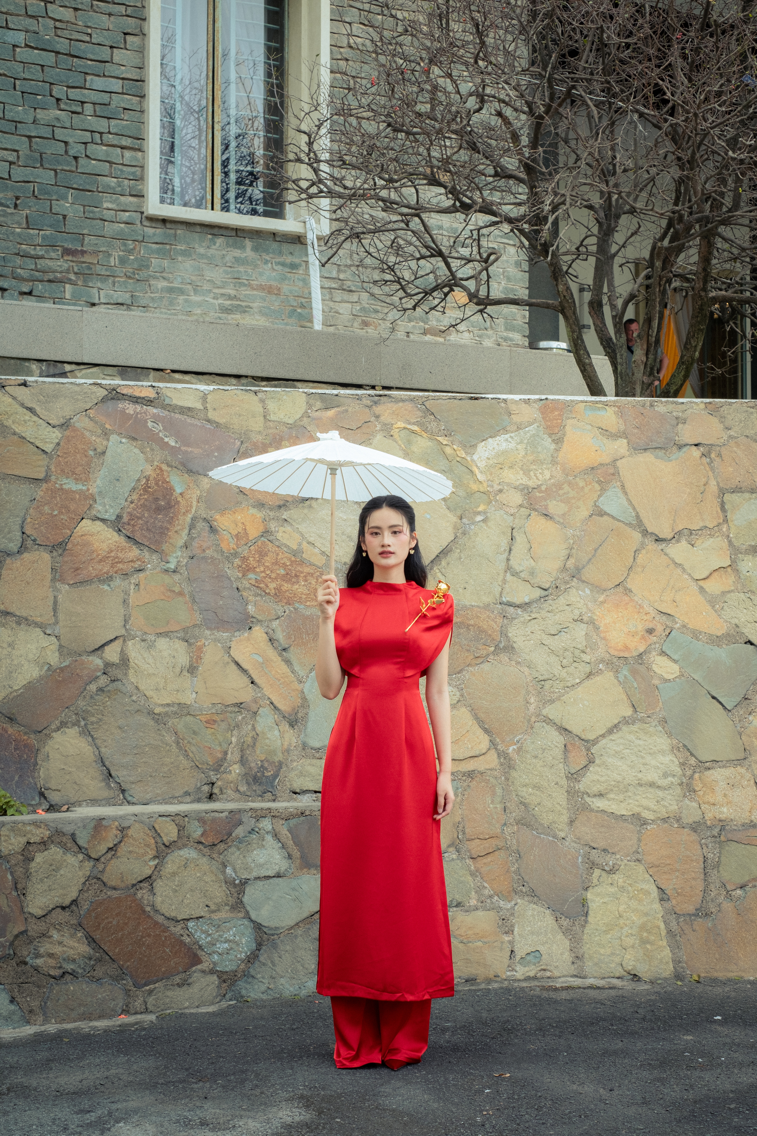 Diện trên người áo dài cách tân sắc đỏ nổi bật, hoa hậu Ý Nhi khoe trọn vẻ dịu dàng, đằm thắm chuẩn người con gái Việt Nam. Màu đỏ rực rỡ làm nổi bật làn da trắng, những đường xẻ tà tinh tế tôn lên vóc dáng thanh mảnh của người đẹp.
