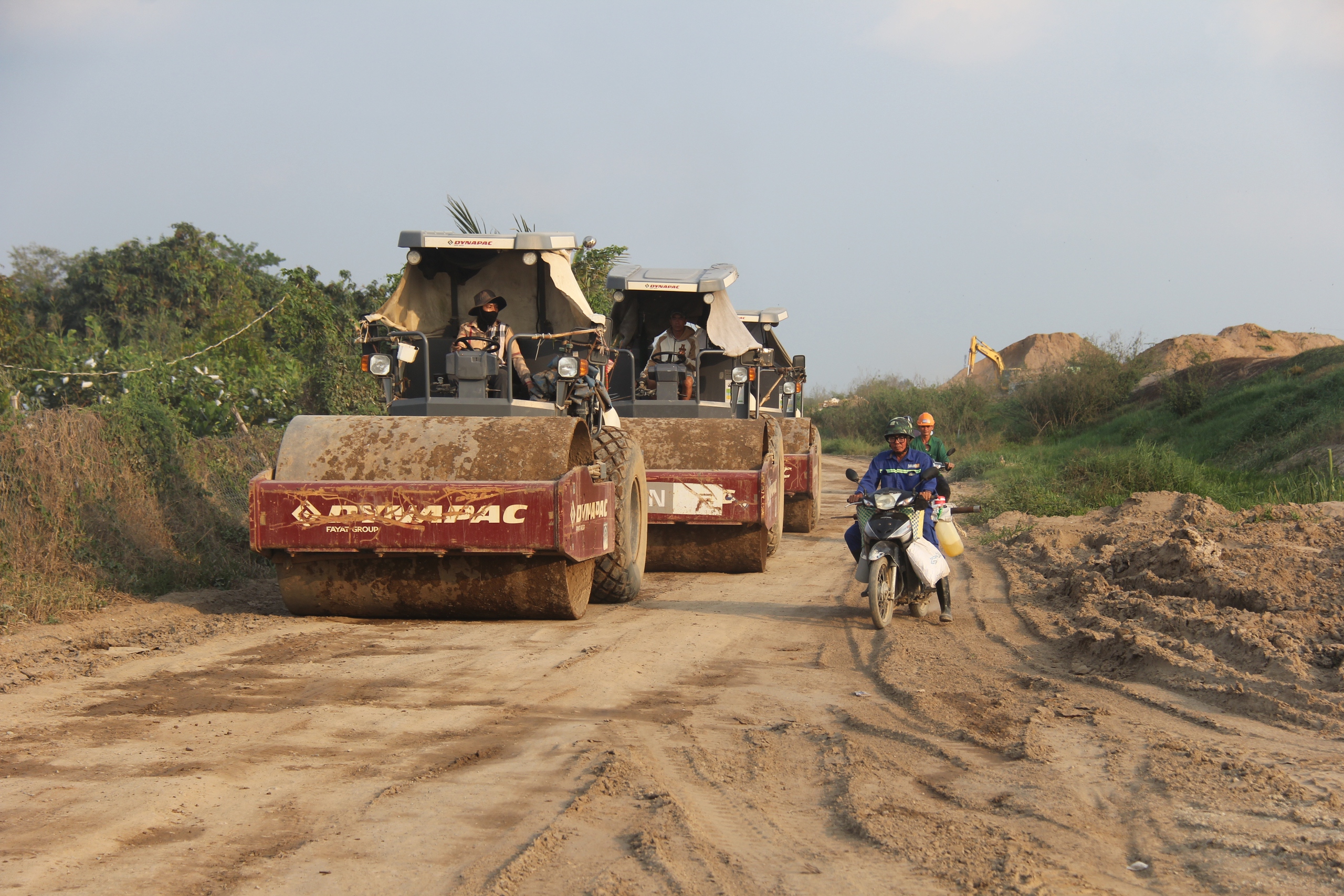 Dọc tuyến cao tốc, nhiều đoạn sau khi hoàn thành xử lý nền đất yếu, nhà thầu đã dỡ tải và cấp phối đá dăm, chờ thời tiết thuận lợi đồng loạt thảm nhựa mặt đường (Trong ảnh: xe lu, thiết bị cơ giới lu lèn lớp cấp phối đá dăm tại nhánh đường dẫn lên cao tốc).