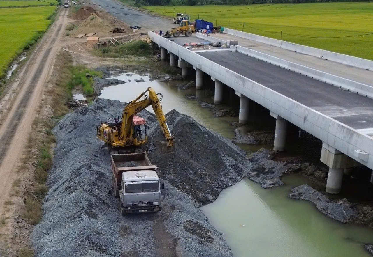 Cầu Hồ Đồng Tường gần nút giao ĐT850 đang được thảm nhựa bề mặt.