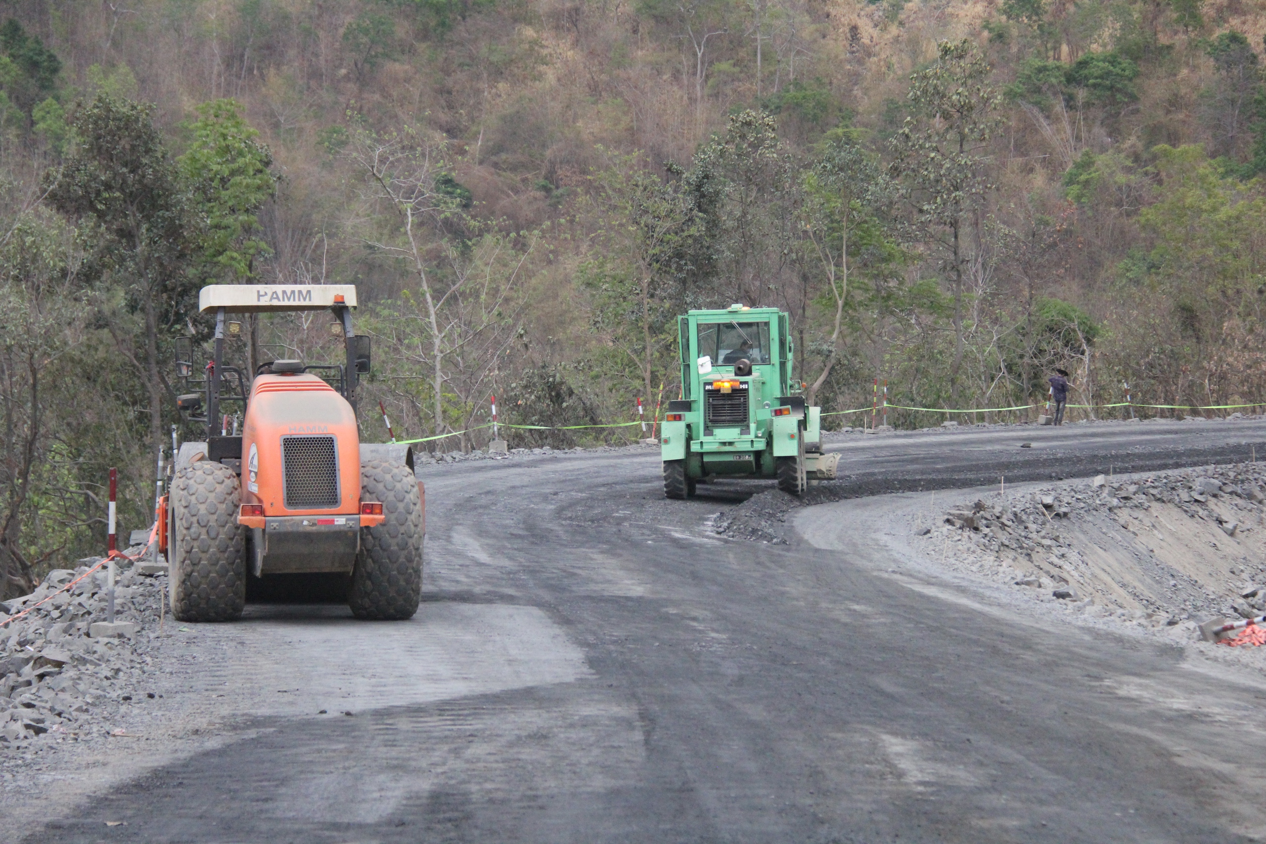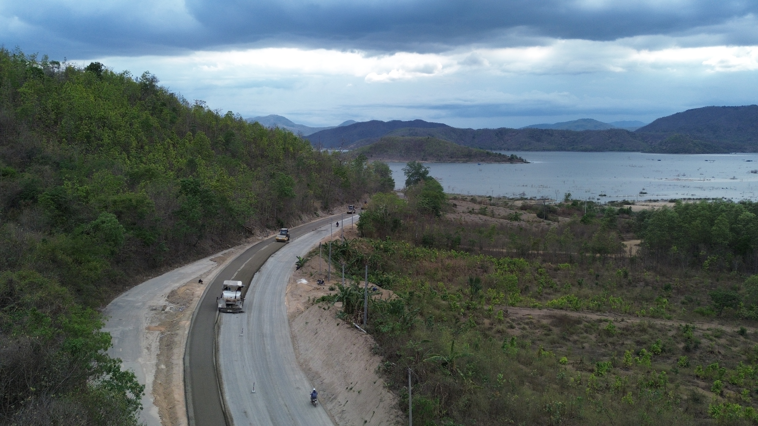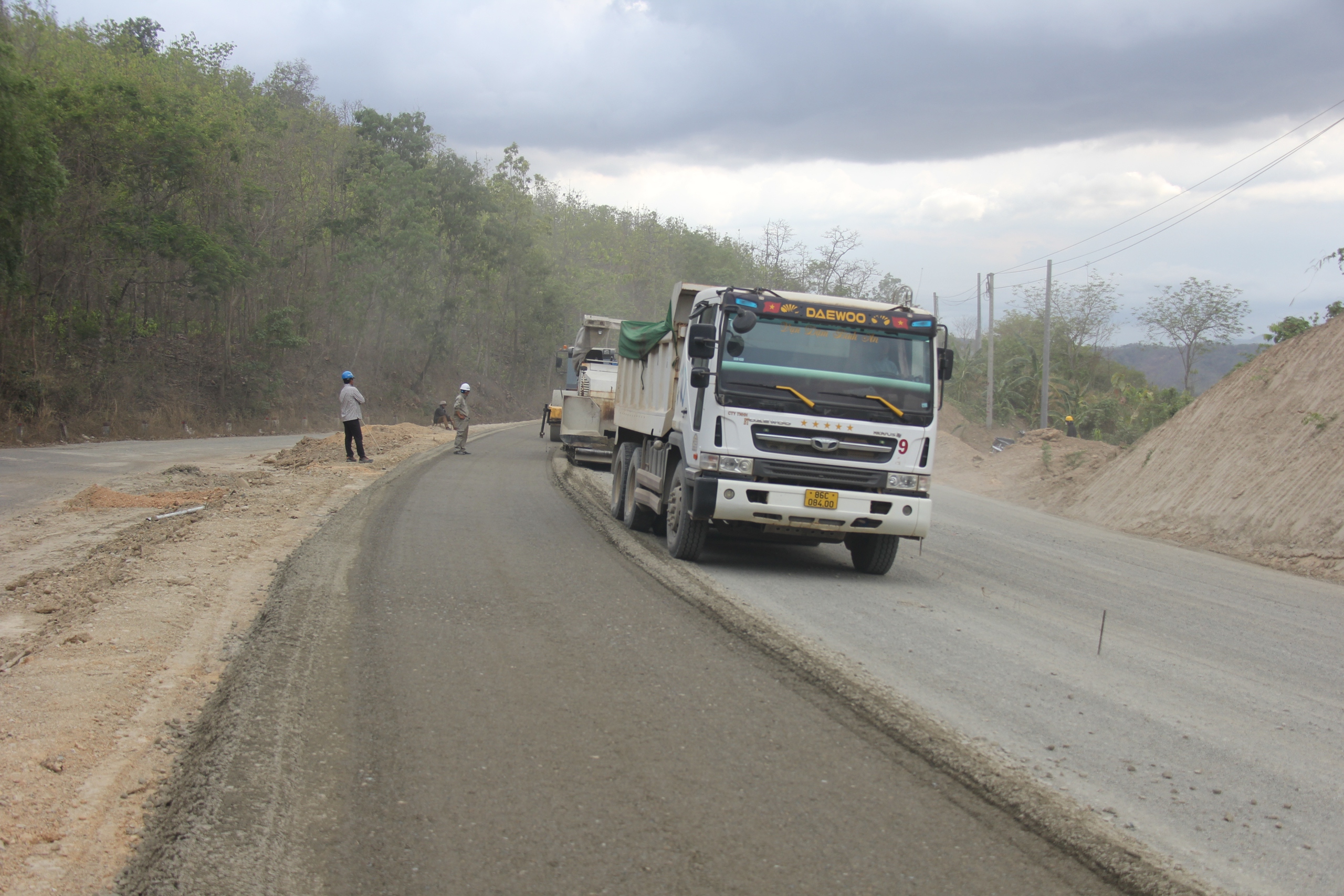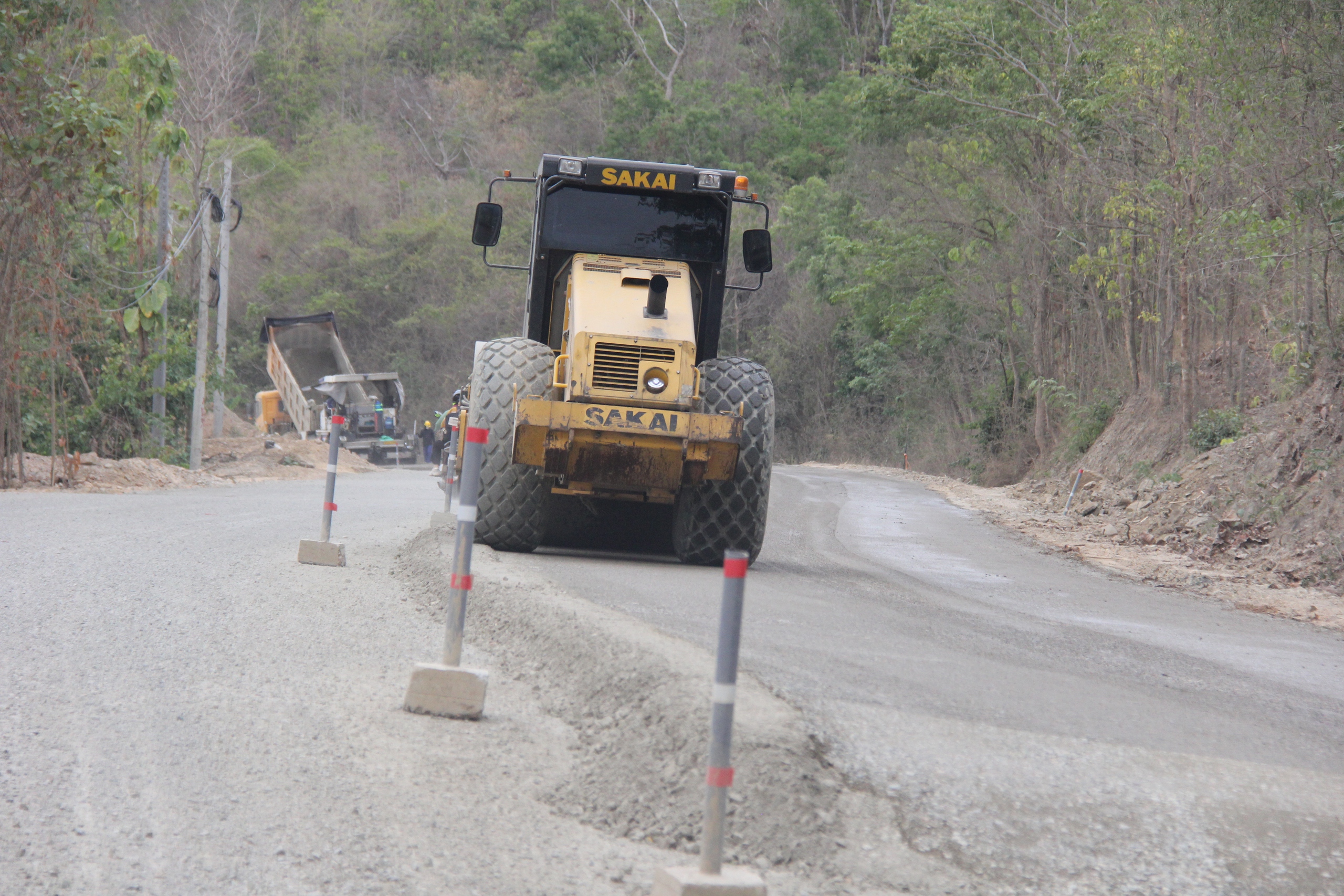 Xe lu nhộn nhịp thi công trên lưng chừng đèo Đại Ninh.