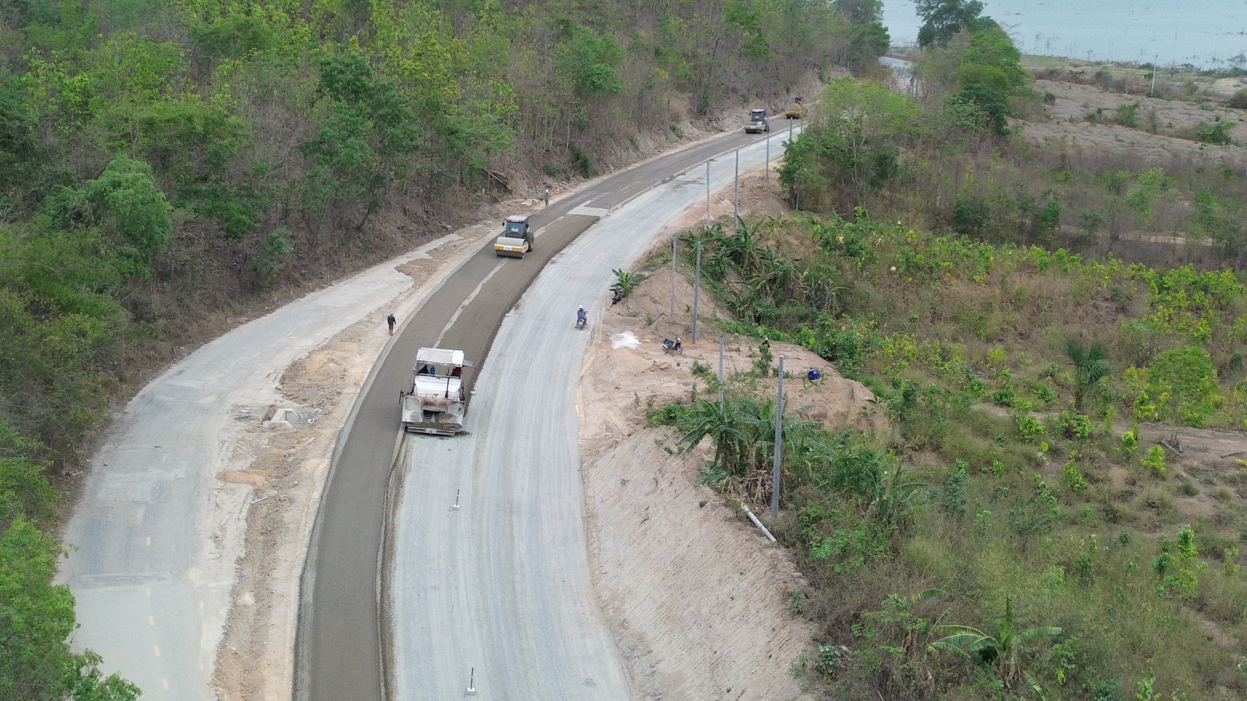 Anh Phùng Thế Lê, Chỉ huy trưởng thi công công ty 368 cho biết, trên đèo nhiều tốp công nhân đang thi công ba ca liên tục, khẩn trương hoàn thiện cấp phối đá dăm, nền đường. "Cuối tháng 4 sẽ thảm nhựa các đoạn trên đèo Đại Ninh, bố trí các mũi thi công cầu, đường làm xuyên lễ 30/4", kỹ sư Lê cho hay.