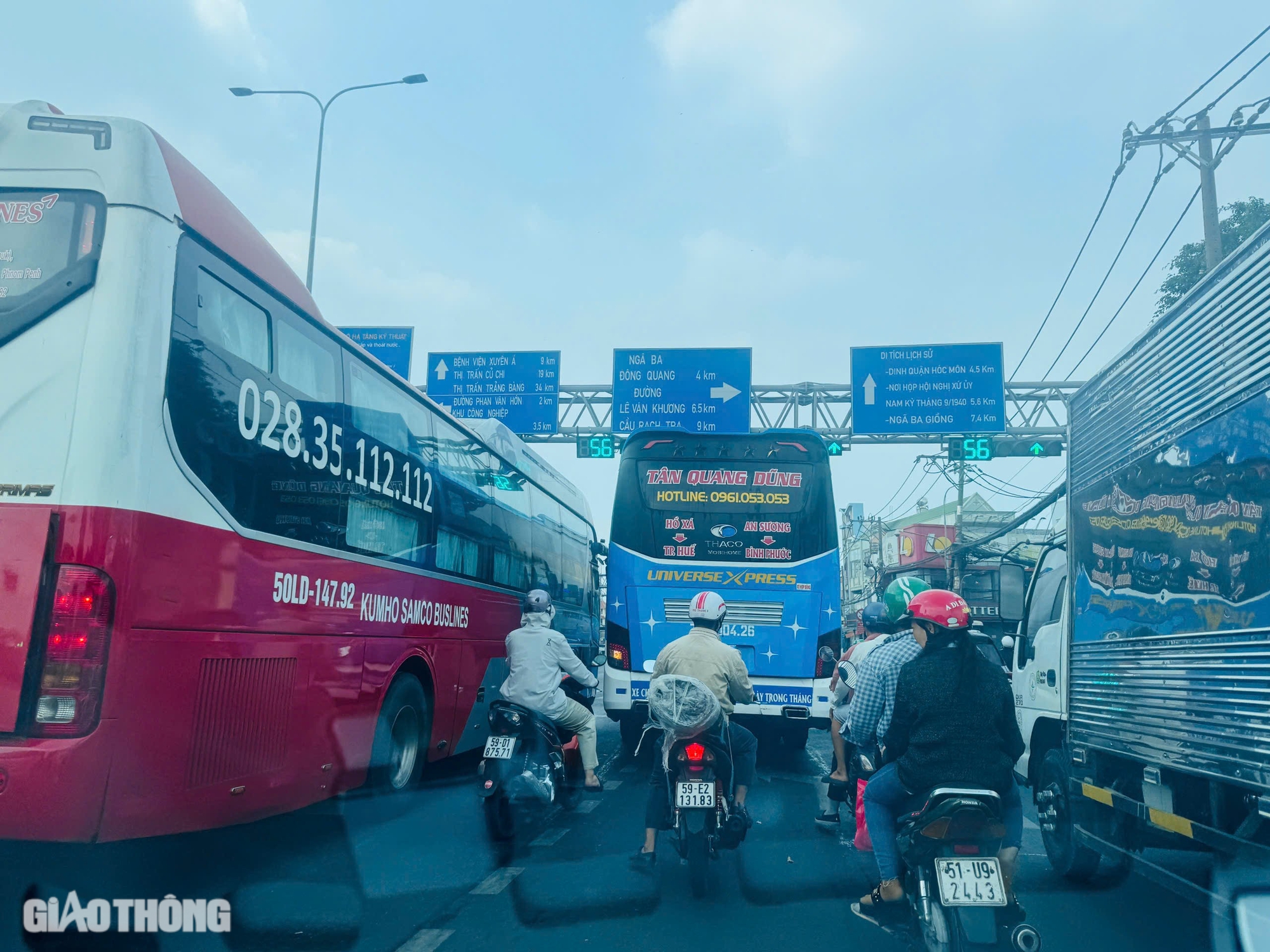 Giữa những chiếc xe khách, xe tải cỡ lớn, người điều khiển xe máy lọt thỏm ở giữa vừa gây trở ngại quá trình lưu thông, vừa khá nguy hiểm. Đây là hình ảnh thường thấy trên quốc lộ 22 vào giờ cao điểm.
