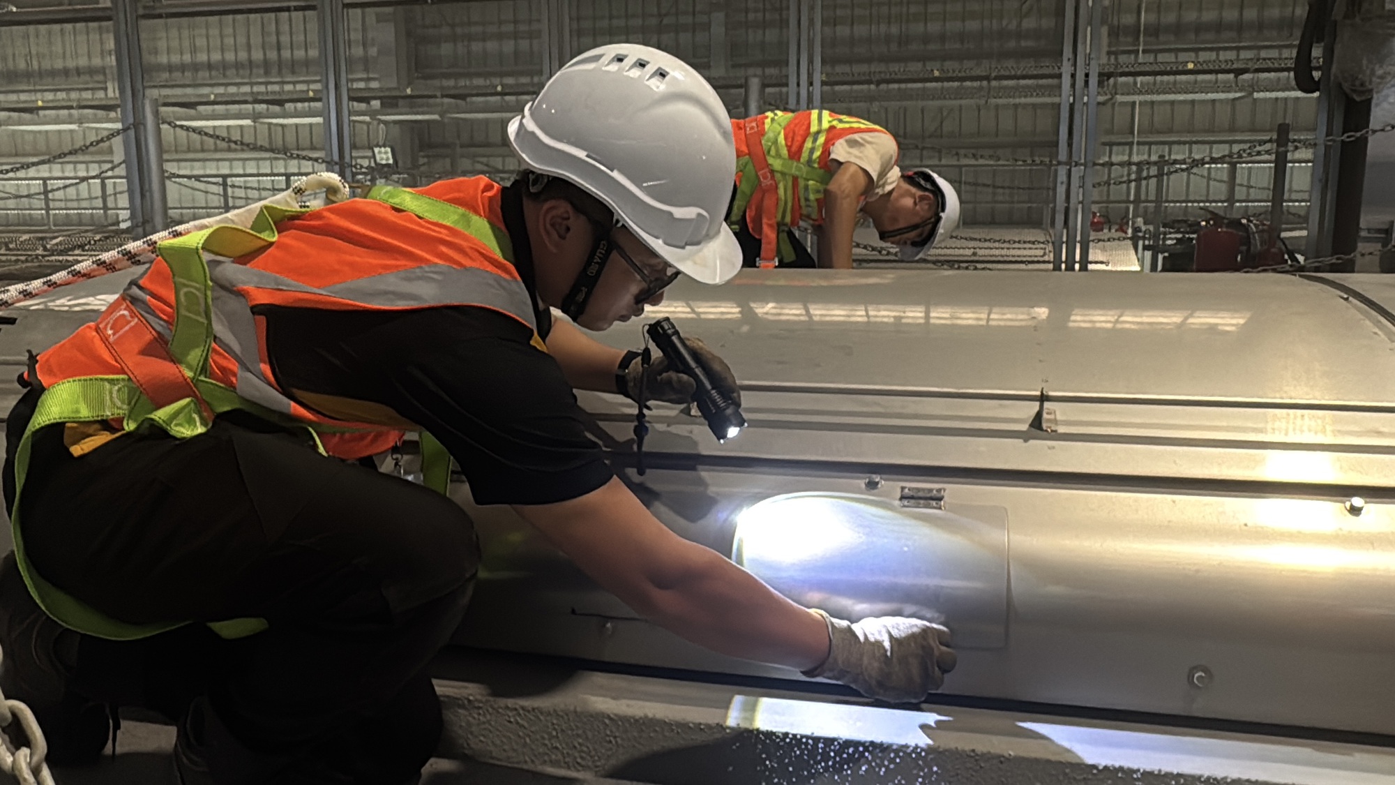 Các kỹ sư được giao nhiệm vụ ở từng vị trí, mỗi ngày sẽ kiểm tra, bảo dưỡng ít nhất 1 - 2 đoàn tàu. Khối lượng công việc theo 3 công đoạn, gồm kiểm tra trên mui tàu, dưới thân tàu và trong toa tàu. Trong clip, các kỹ sư đang tỉ mỉ kiểm tra trên mui tàu các hạng mục như điều hòa không khí, máy lạnh, cần lấy điện...