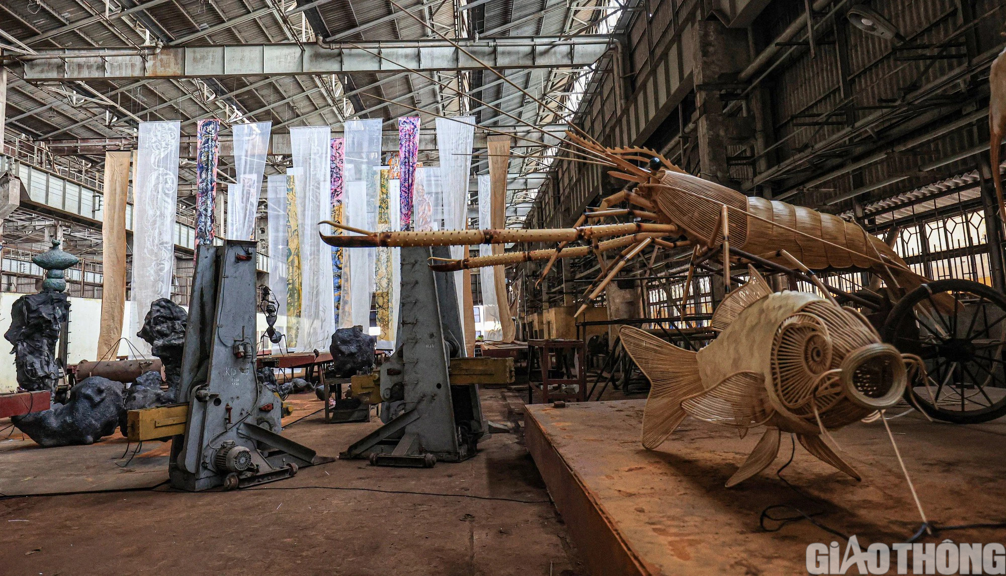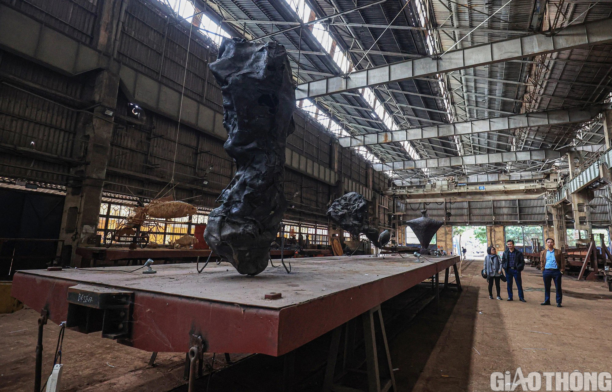 Các tác phầm nghệ thuật được trưng bày ngay trên các bệ (sàn) toa xe hàng đang được nhà máy thi công đóng mới cho các doanh nghiệp vận tải.