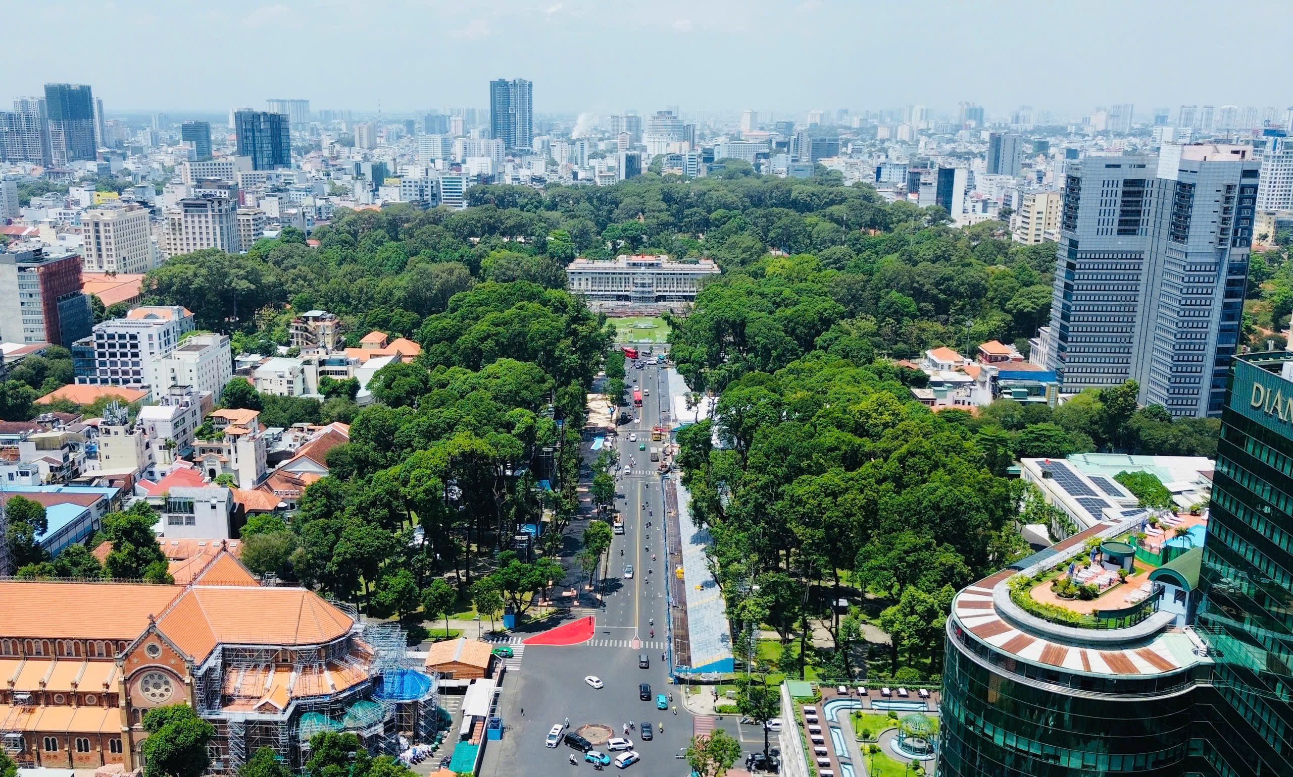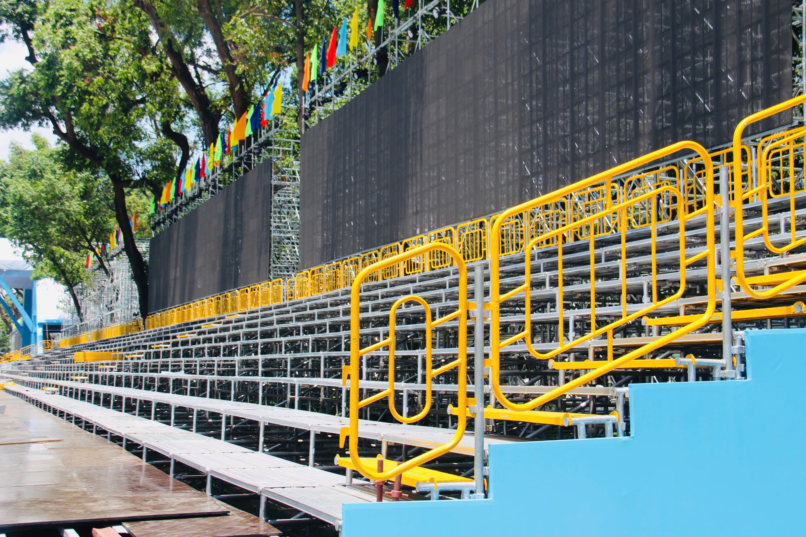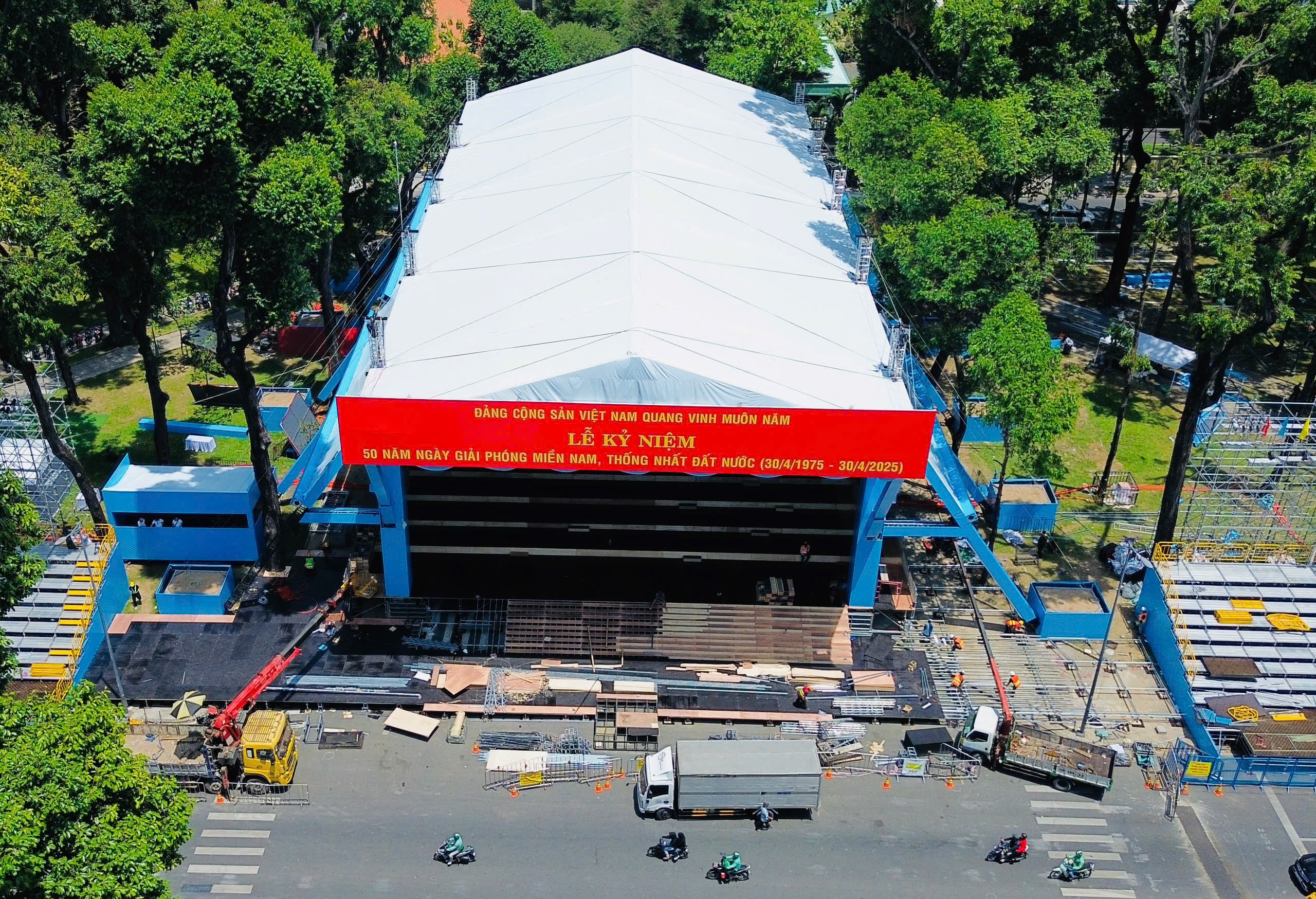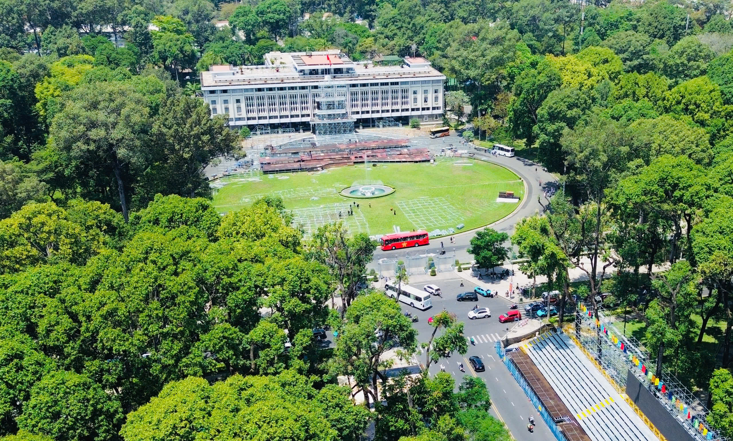 Hiện tại, khu vực khán đài phía bên phải Dinh Thống nhất cơ bản hoàn tất, gồm hai dãy kéo dài từ đường Phạm Ngọc Thạnh đến Pasteur và từ Pasteur đến Nam Kỳ Khởi Nghĩa. Mỗi dãy có 9 hàng đều tăm tắp, phía dưới là hệ thống giá đỡ kiên cố, chắc chắn.
